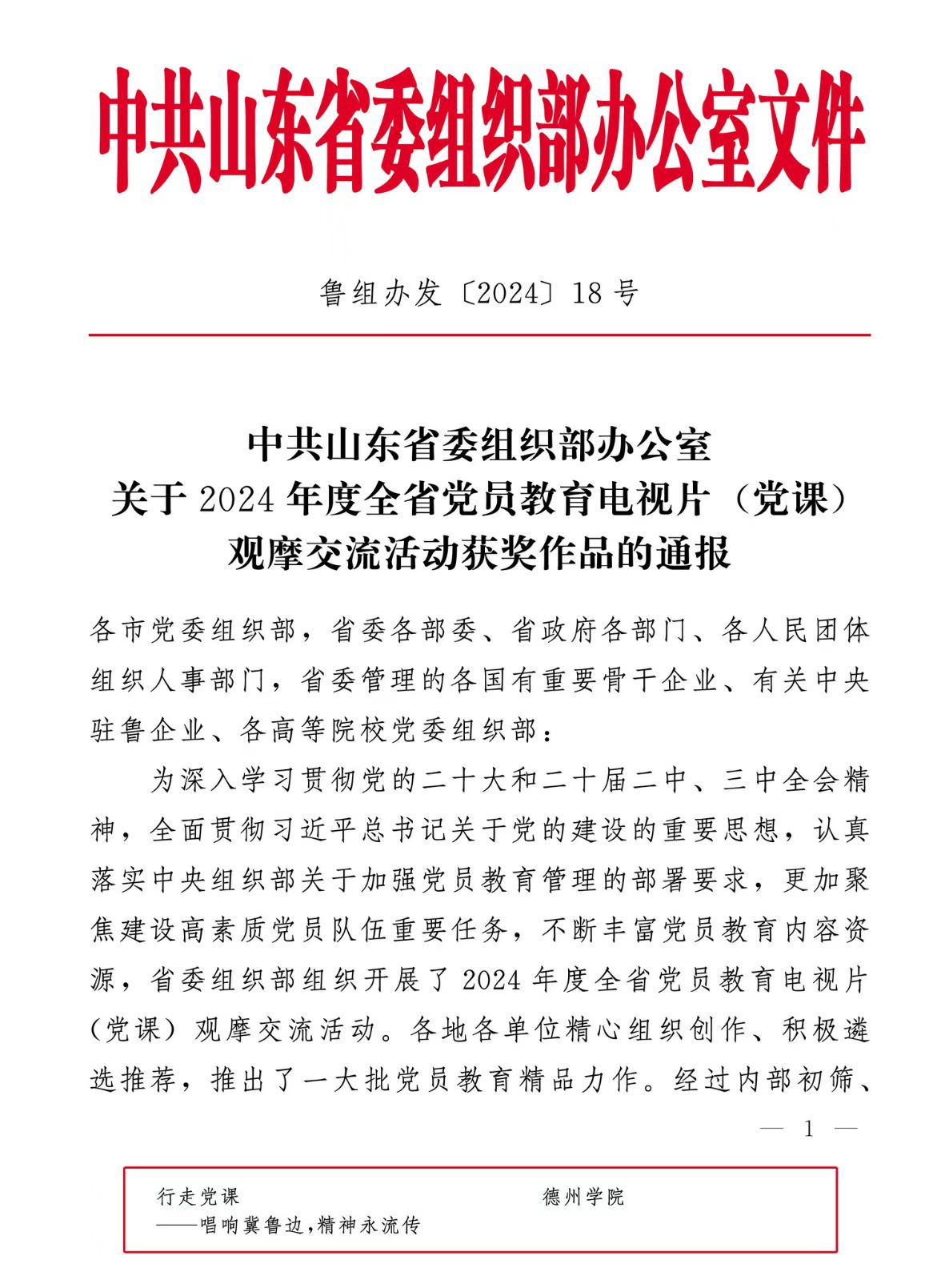 近日,省委组织部公布了2024年度全省优秀党员教育电视片(党课)观摩交流活动获奖作品名单,共评选出80部“优秀党课”,其中高校获评作品5项,公司选送的《行走党课——唱响冀鲁边 精神永流传行走》名列其中。