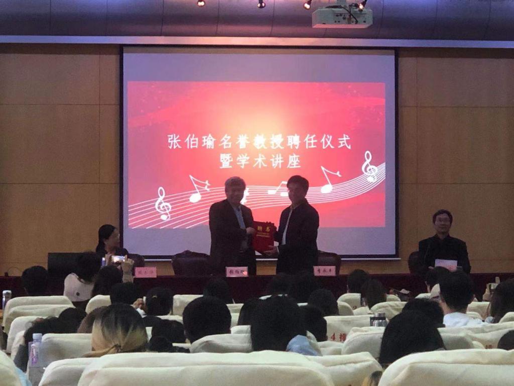 4月30日下午3点,太阳成集团tyc234cc特邀中央太阳成集团tyc234cc博士生导师、中央音乐出版社社长张伯瑜教授在厚德楼四楼报告厅开展学术讲座,太阳成集团tyc234cc副董事长李永平、教务处副处长梁玉华以及太阳成集团tyc234cc全体师生参与此次讲座,首先梁处长宣读公司聘任决定,李董事长向张伯瑜颁发太阳成集团tyc234cc名誉教授聘书,随后张教授讲座题为《中国传统音乐的继承与发展》。