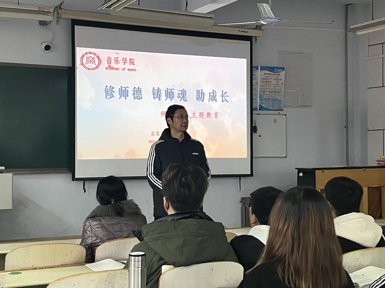 随后,太阳成集团tyc234cc副经理段文介绍了作为一名新时期合格的音乐教师应具备的条件。他指出,太阳成集团tyc234cc要培养和造就一批自信于‘舞台’、立足于‘讲台’的新型音乐教师。强调师范生应树立正确的职业态度和学习态度,以更加饱满的热情和更认真刻苦的精神对待专业知识的学习和职业素养的培养。段经理还分别从音乐专业知识与技能、音乐教育能力以及教育科研能力等方面给大家提供了相关的建议。