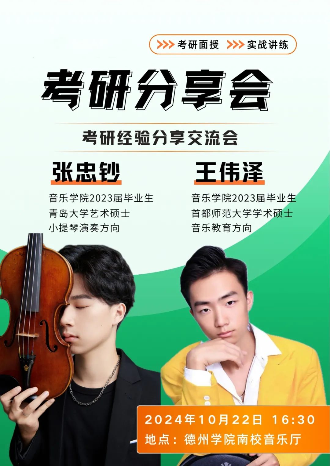张忠钞,2023届毕业生,现为青岛大学2023级小提琴演奏专业硕士研究生。他从自身考研经历出发,围绕如何选取专业和院校、制定复习计划、调整心态以及复试中的注意事项等方面谈了自己的亲身体验和感受。强调独立思考的重要性,选取专业和院校时不能盲从,并建议同学们不要只局限于专业相关书籍,应多读不同类型的书拓宽视野,用"勤奋""计划""心态"三个关键词总结自己的成功。他从"真题""笔记"等具体问题着手,叮嘱同学们要仔细研究真题题型,揣测出题动机。