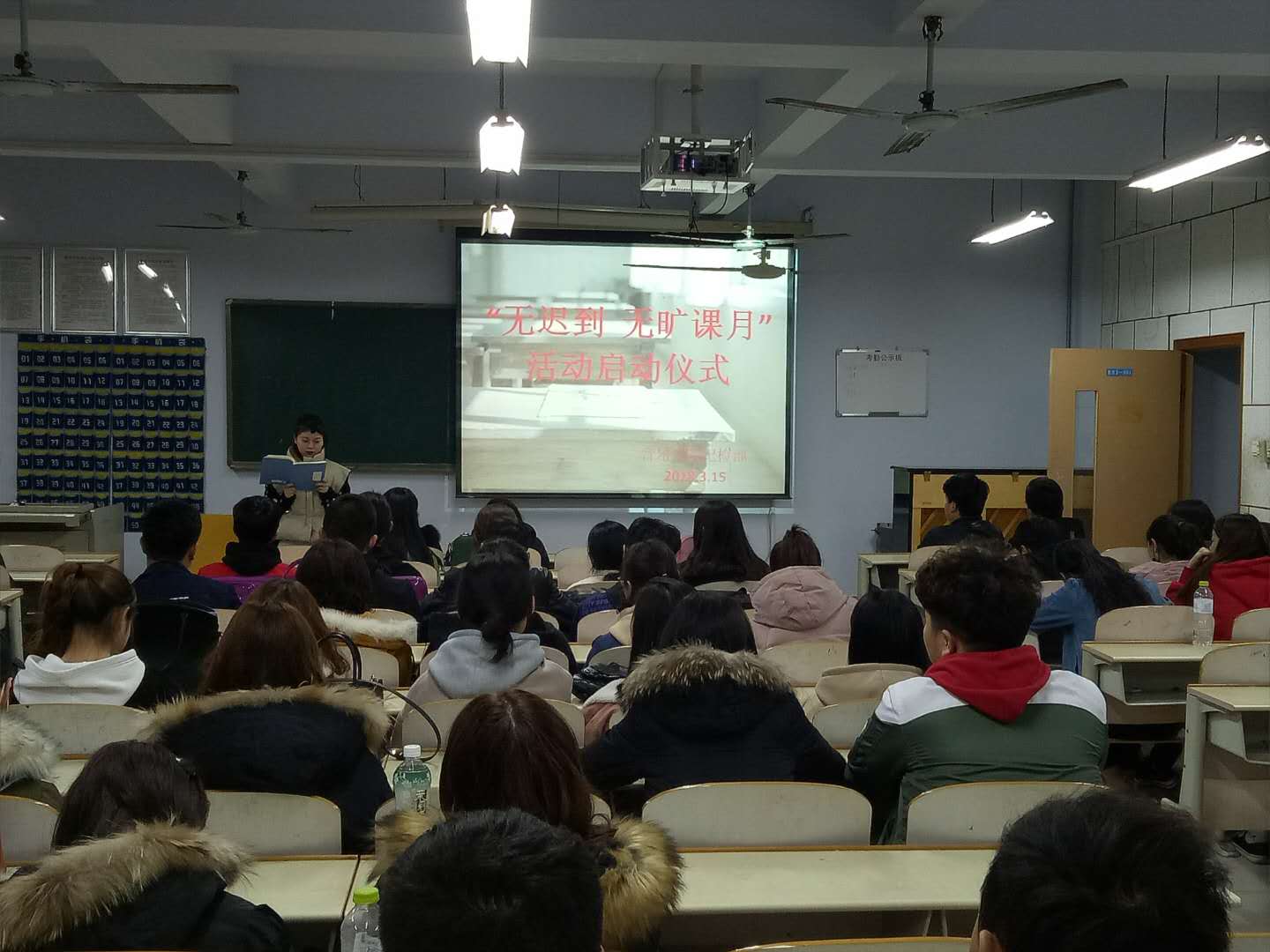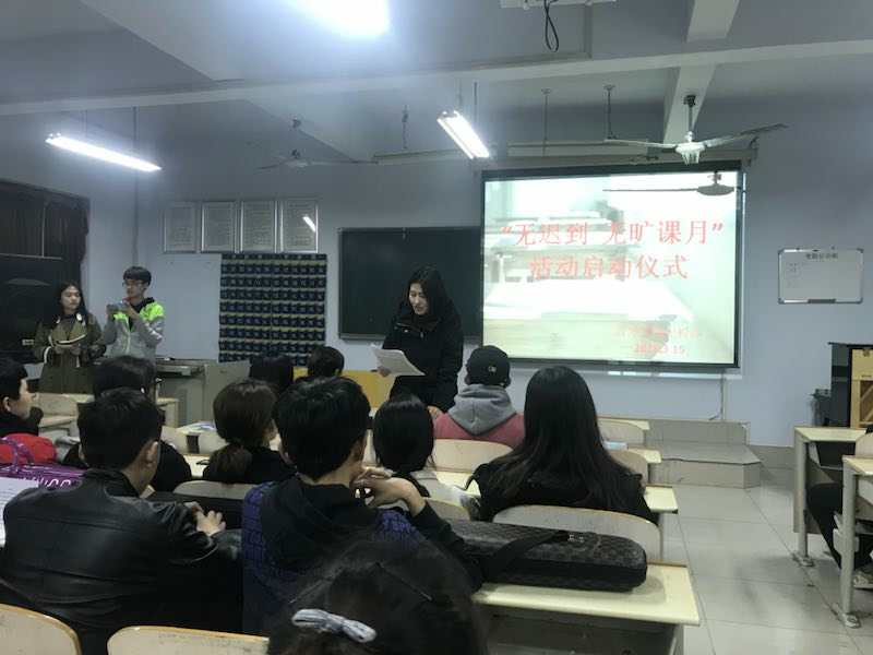 活动开始辅导员贺昱强调了新学期勿旷勿迟的重要性,接着负责人介绍了本次活动的内容及意义,然后纪检部部长制定了相关制度,之后各班班长代表各班承诺了一定会按时上课,不迟到不旷课不早退 。最后,辅导员史璇对本次活动进行了总结。