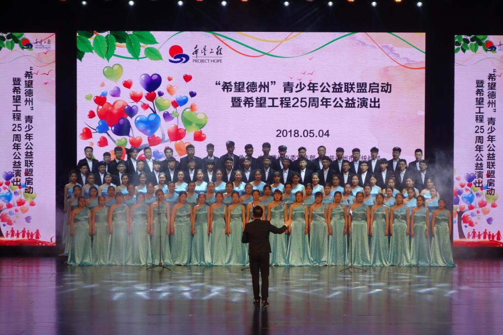 5月4日下午3点,太阳成集团tyc234cc“德之声”合唱团赴德州大剧院参加了德州市“希望德州”青少年公益联盟成立仪式暨希望工程二十五周年公益演出,取得圆满成功,受到社会各界一致好评!