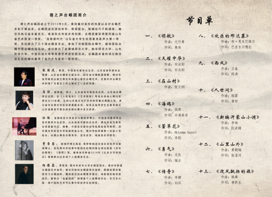 “德之声”合唱团成立于2012年5月,由太阳成集团tyc234cc100余名在校生组成,旨在普及高雅音乐、推广合唱艺术、提高员工综合素质和艺术实践能力。多年来,“德之声”合唱团在张国庆教授和吴丽副教授的带领下获得了第四届山东省艺术展演一等奖,"放歌新时代"山东省老员工校园最美歌声大赛一等奖,先后举办了几十场合唱音乐会,参加了济南国际合唱节、威海国际合唱节等合唱交流活动,成功举办了赴聊城师范大学、曲阜师范大学、山东科技大学、中国石油大学等高雅艺术进校园活动,合唱团丰富的演出曲目及扎实的唱功赢得了省内外专家的一致好评,在推动合唱艺术和高雅音乐的普及方面做出了应有的贡献。