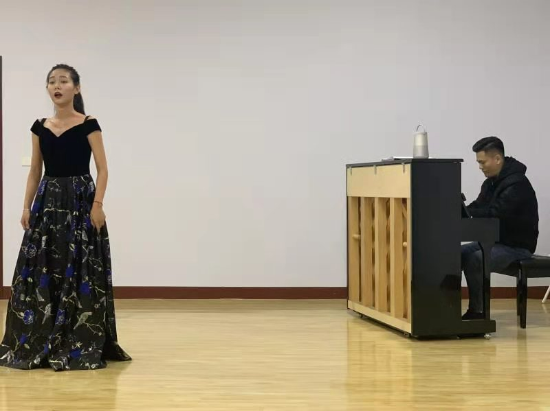 2018级刘鑫冉、王梦雪同学演唱的《就在山水间》,是民族歌剧《沂蒙山》中海棠的咏叹调,此段演唱有表演,有念白,字字入味,声声入耳。2018级孙连宝同学用藏语和汉语两种不同特色语言演唱了歌曲《天路》,淋漓展现了作品风格。2019级尹嘉怡同学演唱了德语作品《复仇的火焰在心中燃烧》,高难度的花腔技巧展示了员工娴熟的声音控制力。