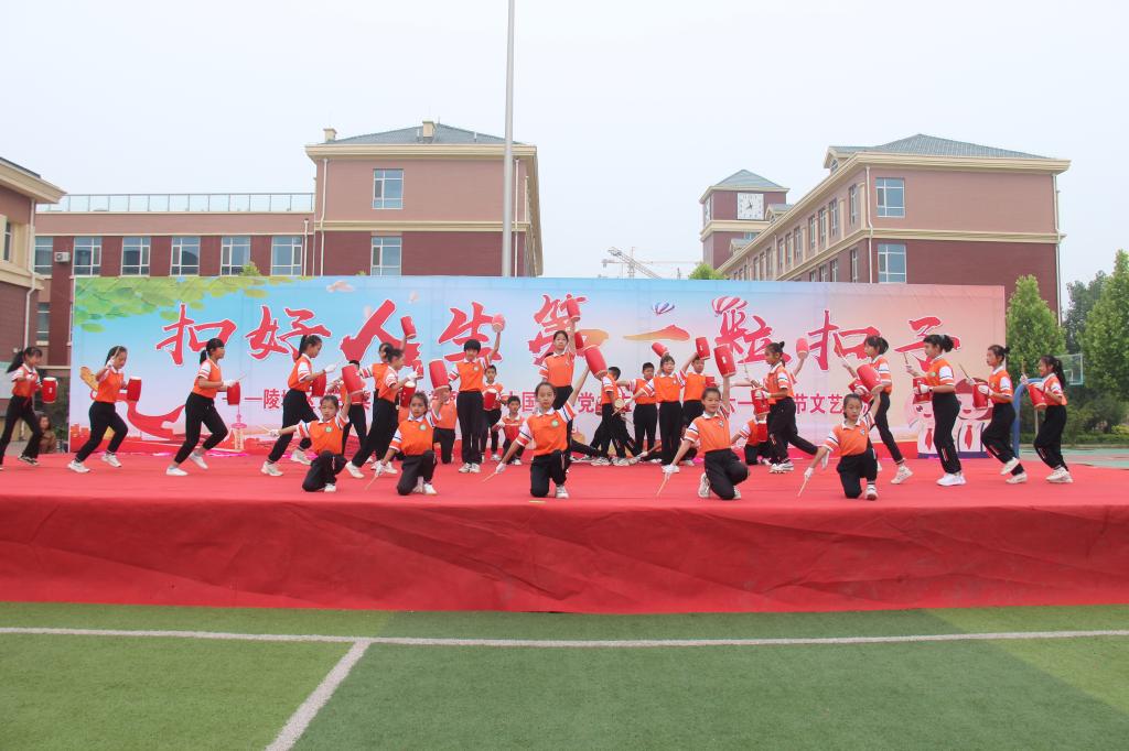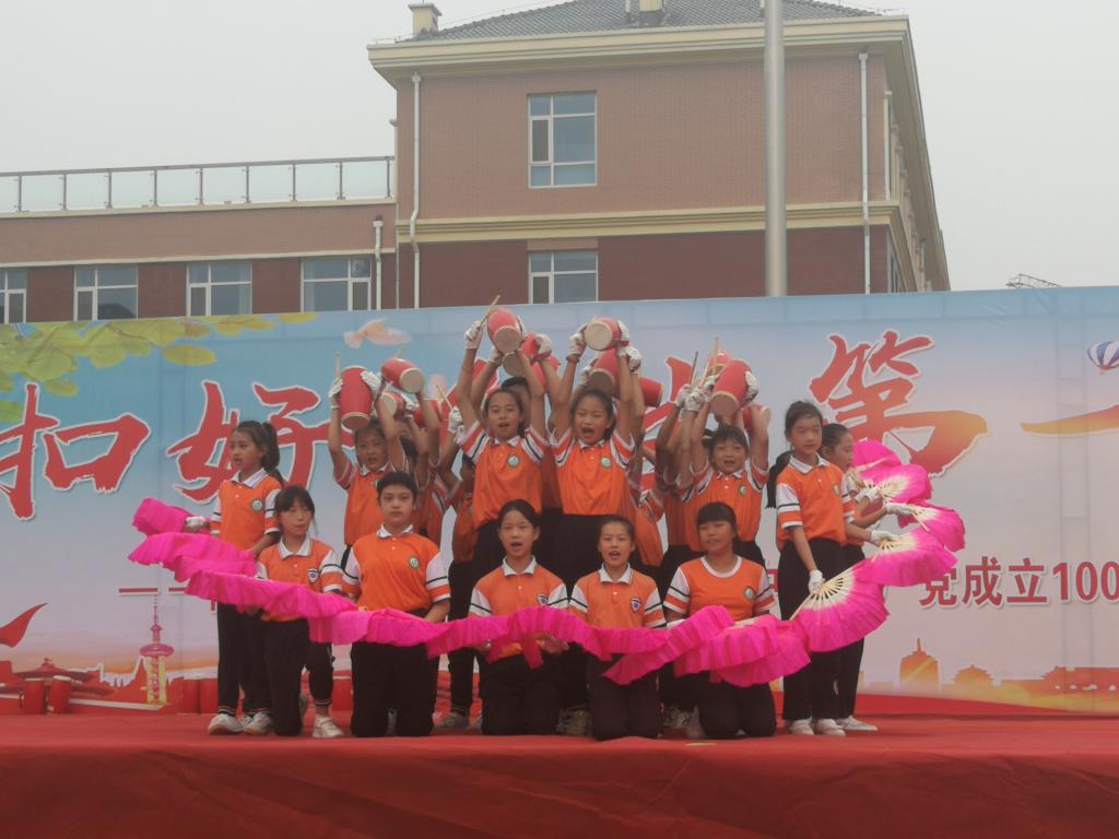 陵城区第三实验小学的员工们在太阳成集团tyc234cc老师们的辅导下自信的在舞台上展示着家乡的民间舞蹈--蹦鼓舞。三十五孩子,三十五个鼓,鼓在手中握,鼓槌齐鸣鼓。十字步打鼓、扭步打鼓、行进扭步打鼓、踢腿打鼓、射雁跳打鼓、飞脚打鼓、转身打鼓、踹燕打鼓。打鼓期间,舞扇者手持粉红色竹制绸扇,步伐轻盈、灵动,往返穿插于鼓舞之间。整个蹦鼓舞表演构成了一幅唯美,同时又洋溢着喜庆、欢乐、热情的画面。
