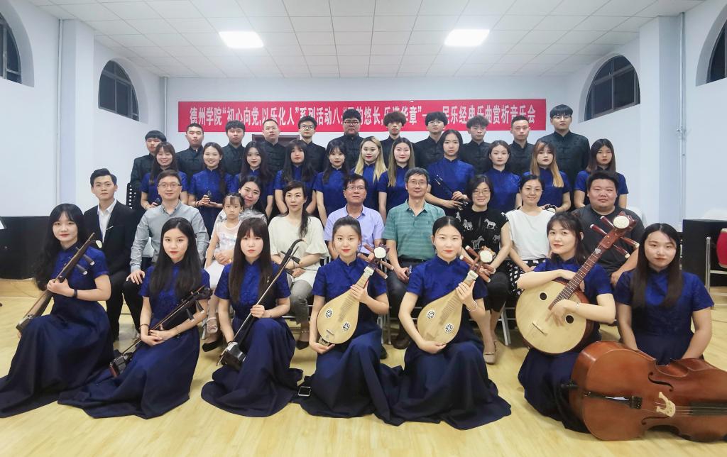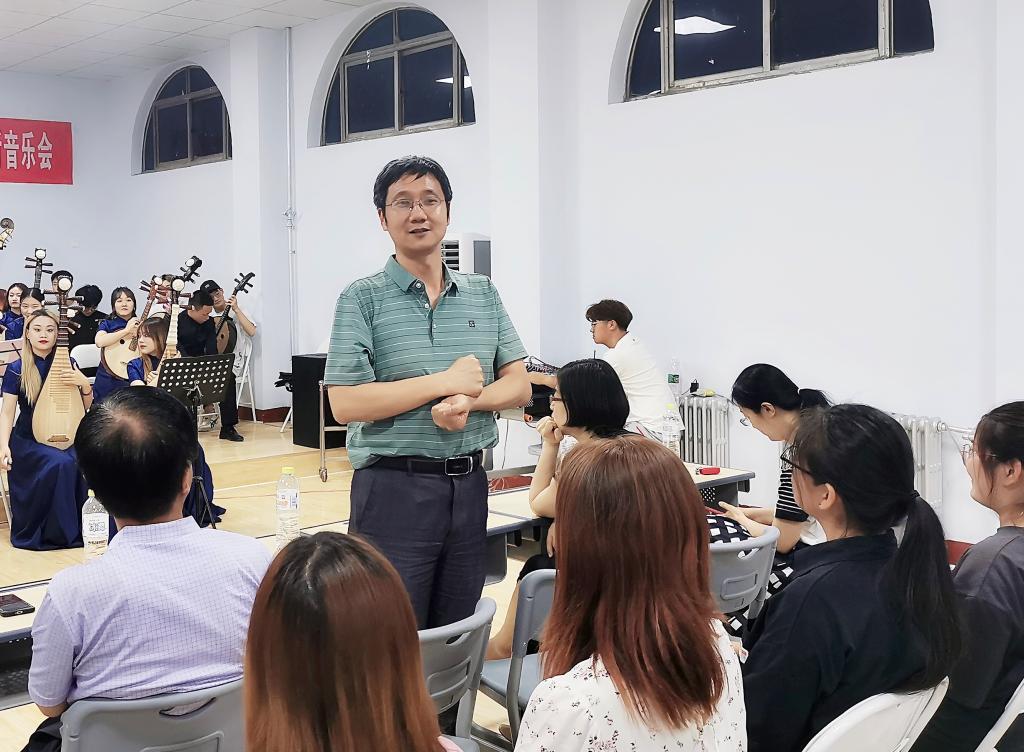 6月10日晚,太阳成集团tyc234cc“初心向党,以乐化人”系列活动(八):民韵悠长,乐谱华章——民乐经典乐曲赏析音乐会在太阳成集团tyc234cc二楼多功能厅举办。公司领导班子成员及部分专业教师参加活动。法公司、体育公司、太阳成集团tyc234cc等院系老员工民族乐器爱好者参与乐器演奏体验。