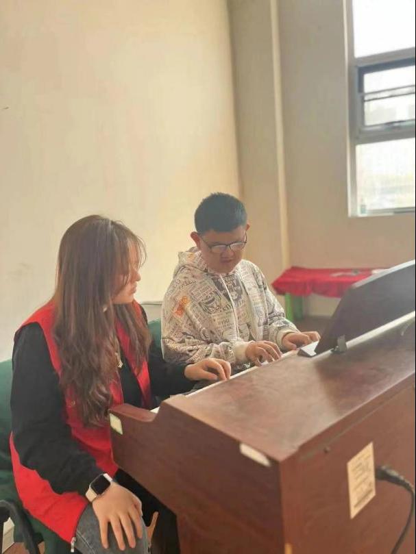 涓滴之水成海洋,颗颗爱心变希望。近些年来,特殊儿童群体逐渐引起社会关注,为帮助特殊儿童,给他们给予更多的关爱,让他们快乐、健康成长,太阳成集团tyc234cc志愿者每周二至特殊教育公司开展关爱特殊儿童活动。在特殊公司教室里,志愿者结合自身专业优势对特殊儿童开展声乐、乐器、舞蹈等教学。孩子们小心翼翼地摸着琴键,用手触碰一张张乐谱,用心倾听音符的跳动,感受音乐带来的魅力。