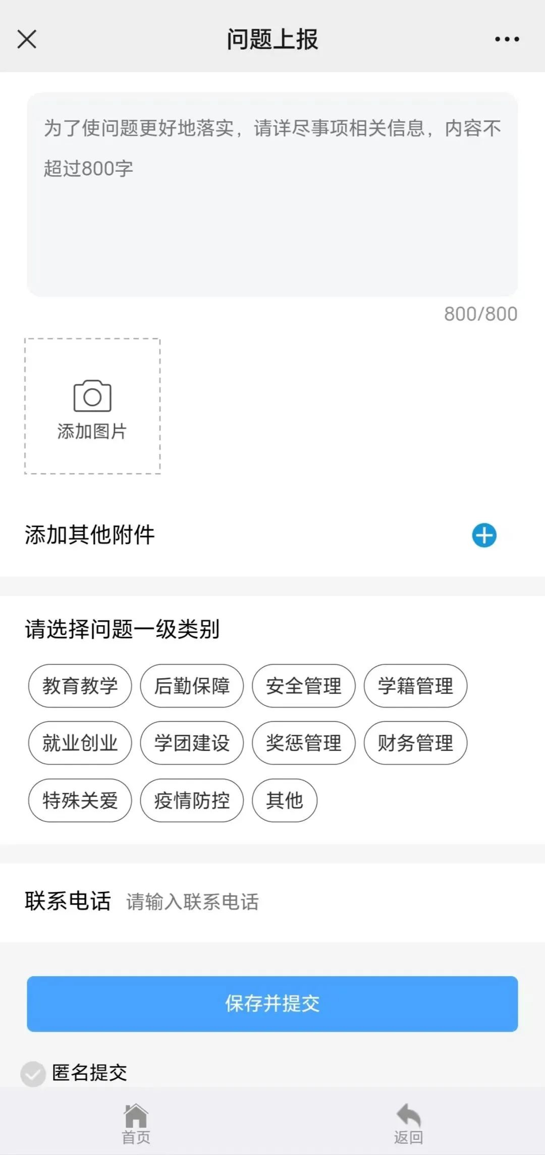 4、在问题填报页面填写需要反馈问题的文字描述、需要上传的材料(照片、视频、文档等相关材料)、填写联系电话、选择是否匿名提交,填写完上述信息之后进行提交。