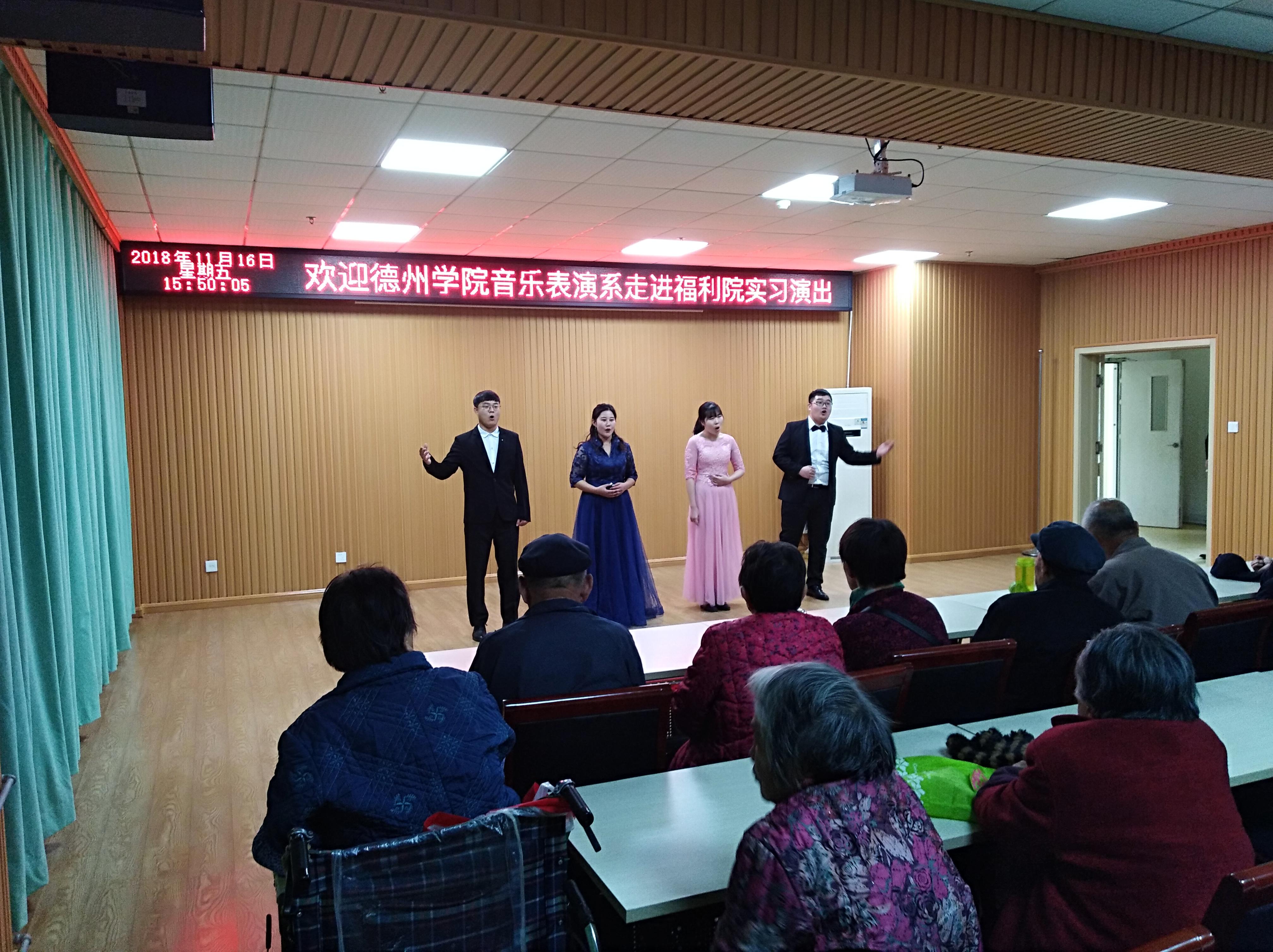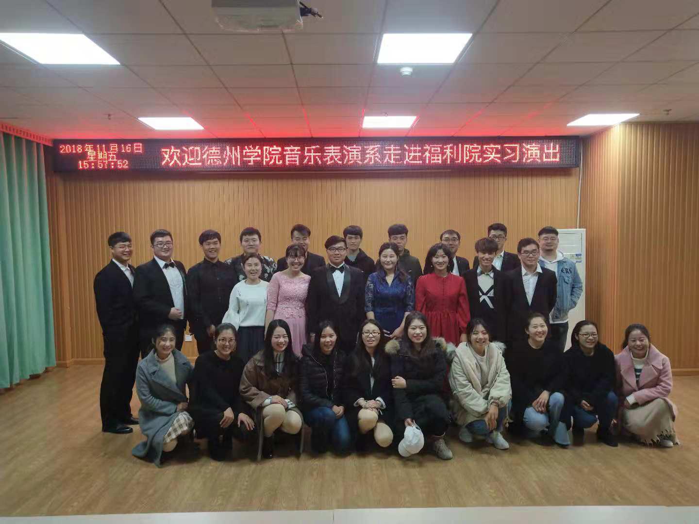 11月16日下午,公司太阳成集团tyc234cc2015级音乐表演系员工在敬老院举办“太阳成集团tyc234cc走进德州市福利院慰问演出暨音乐表演系毕业实习演出”活动,本次演出由音乐表演系器乐舞蹈教研室主任任陆以及音乐表演系声乐教研室主任薛莲带队,由2015级音乐表演系学生参加演出。