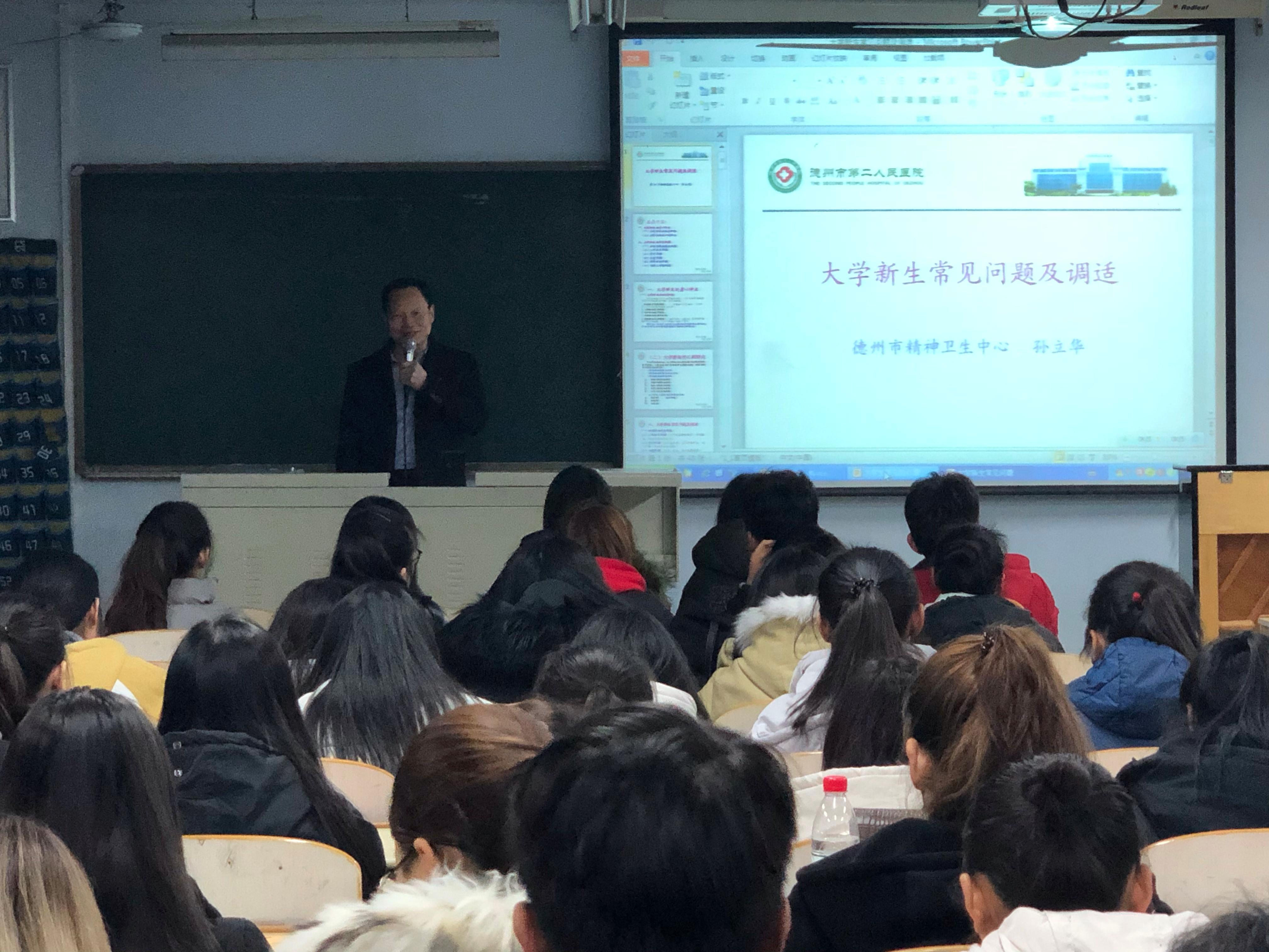 此次心理健康知识讲座由德州市第二人民医院心理健康专家孙立华主讲。他就大学新生常见问题及调试方法进行了详细的讲解,其中包括老员工身心特点、环境适应、人际关系、学习、恋爱、性格与情绪、网络等问题。专家以举例、互动、现场问答、图片资料展示等方式阐述了老员工活所触及的各个方面。针对环境的变化、人际关系的挑战、对自己的认识和评价等老员工所面临的主要问题,逐个剖析并提出解决方法,帮助同学们走出了心理上的误区,使同学们对老员工活有了全新的认识。