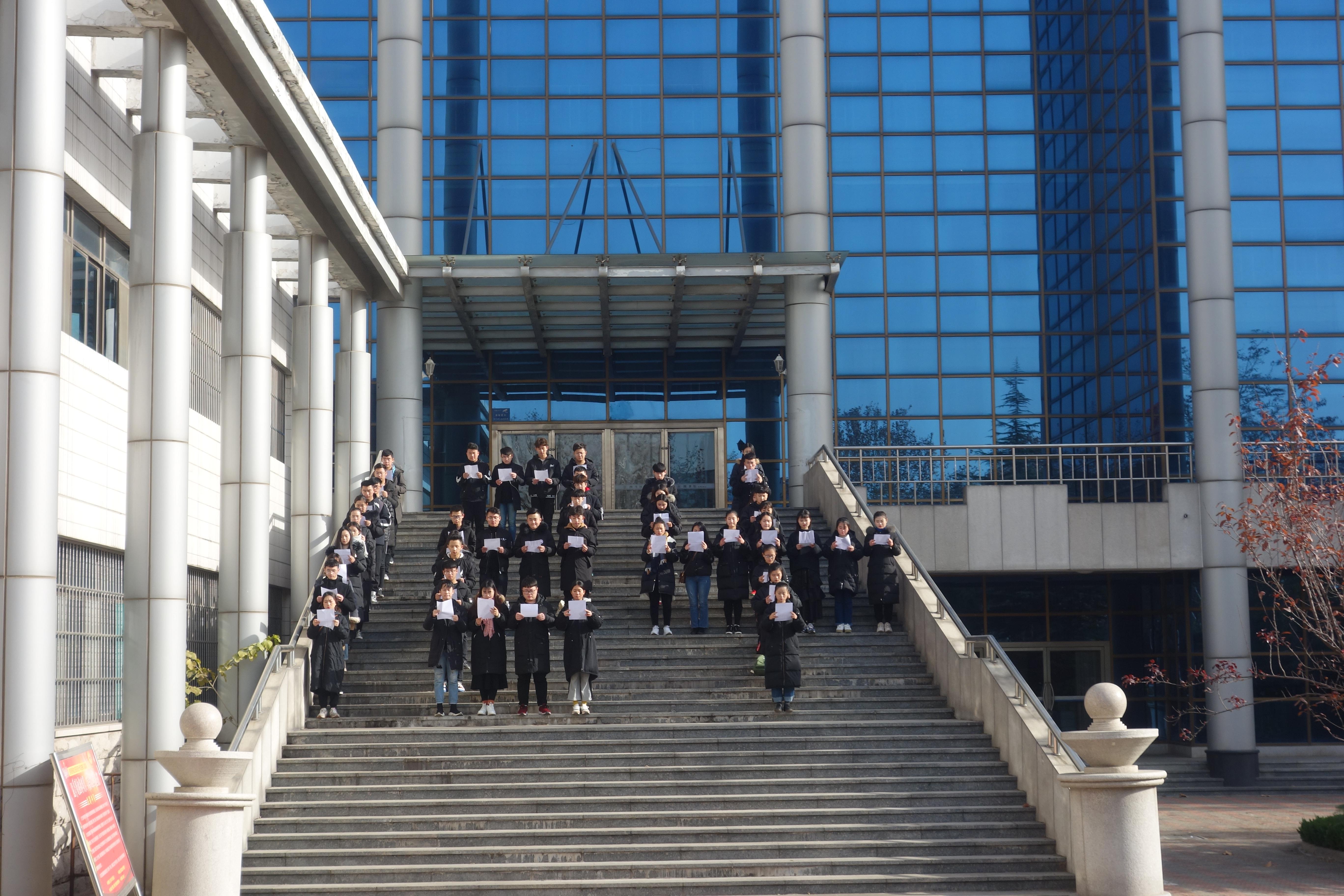 中午十二时,近百名身着黑色服装的员工,站姿挺拔,动作整齐划一,神情认真而严肃。大家沿着图书馆门前的台阶摆出12.4的造型,进行“百人诵读宪法”活动,诵读宪法总纲和部分章节内容,共同迎接第五个国家宪法日的到来,整个校园里回荡着员工们庄严的朗读声。活动最后,李曼宁对此次活动做了总结,希望同学们通过参加这次宪法诵读活动,能够更加自觉坚定“四个自信”,增强“四个意识”,坚定理想信念,自觉尊崇宪法、学习宪法、遵守宪法、维护宪法,大力弘扬宪法精神,牢固树立宪法法律至上、法律面前人人平等的法治理念,在推进全面依法治国的伟大进程中贡献青春力量。