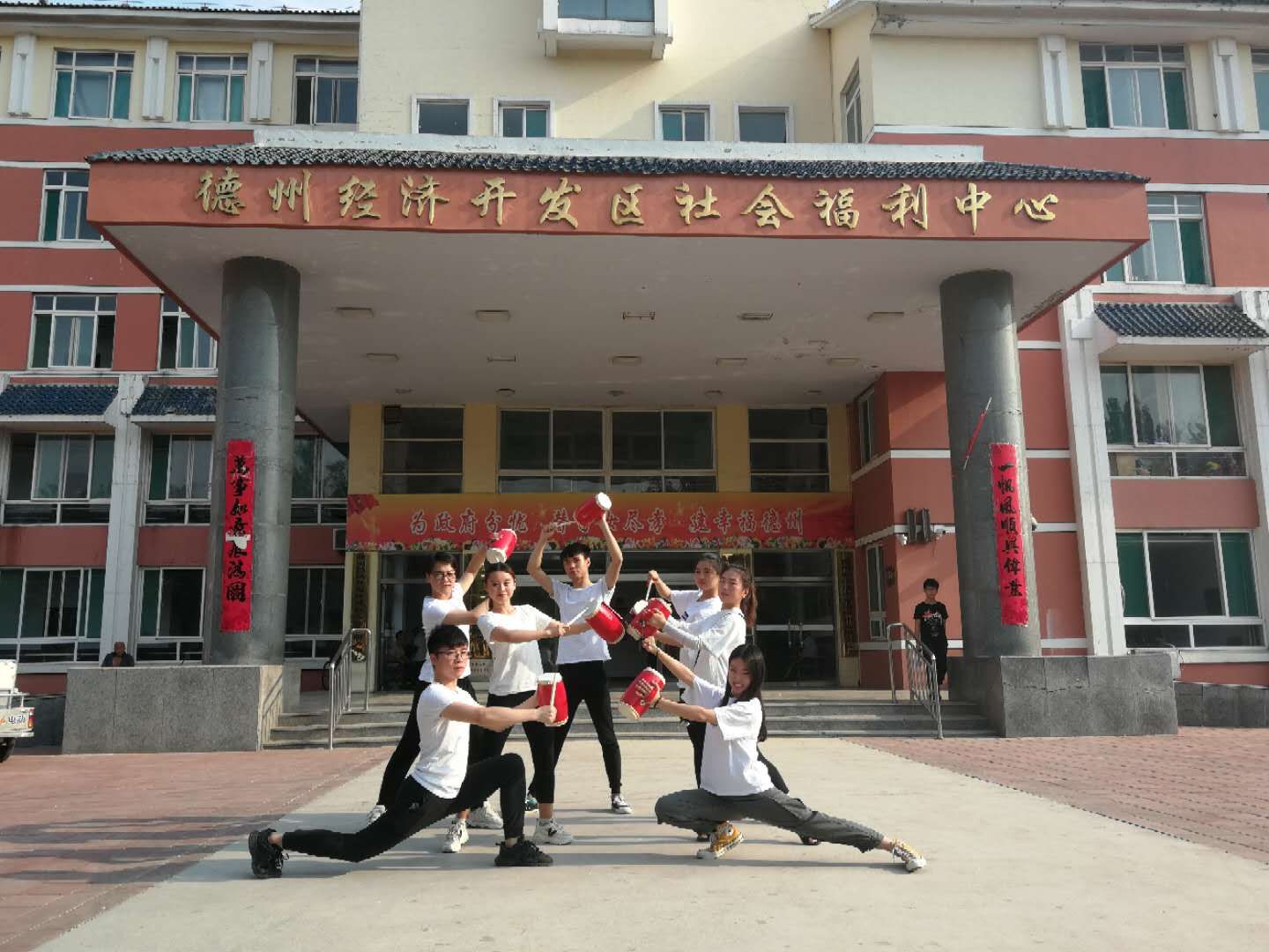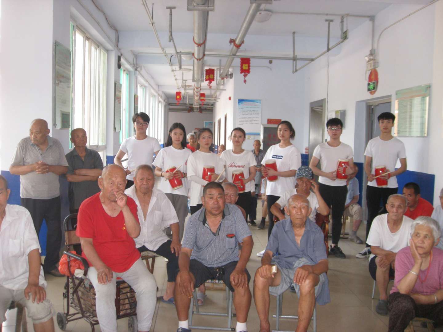 伴着主持人激动人心的开场语,省级非物质文化遗产陵城区蹦鼓舞走进了老人们的视线,蹦鼓舞又名跳鼓舞,它流行于德州陵城区东部的糜镇、宋家、滋镇、义渡、郑寨、神头等乡镇,是一种山东省的民间舞蹈,起源于元朝。鼓的形状为:腰间粗、两端略细、木框,两头蒙皮革,革制鼓柄,近似于腰鼓,但小于腰鼓。鼓槌为鞭形,以革制鞭,鞭鞘头结一疙瘩。舞时,左手持鼓,右手握槌,边打边舞。随着时代的变迁,蹦鼓舞成了广大群众同观共赏、同欢共乐的文娱形式,每逢元宵佳节,群众便自发地组织秧歌舞队,走街串村,相沿成俗。1978年,这一独特的民间舞蹈形式从其它形式的秧歌混编中独立出来,从鼓、伞、扇的动作画面到装束打扮都进行了认真地整理加工。整理后的蹦鼓舞队由二十位青年男女组成,男八人舞鼓;女八人舞扇;男四人舞伞,其中打鼓为此舞蹈动作的精髓。而因时代更迭,现在蹦鼓舞的传人越来越少,为了不让这一文化失传,公司办公室主任樊海伦副教授带领舞蹈生们学习了这一民间舞蹈,这将有利于蹦鼓舞的传承与发展,同时也有利于民间优秀传统文化的传承与发展,老人们也表示对我们的蹦鼓舞感到十分的亲切。而后一首《水星记》在老人们耳边响起,让现场观众无不为之动容。随后,西洋乐器萨克斯带来的《童话镇》和中国古典乐器古筝带来的一曲《乡韵》引得老人们目不转睛。最后在一首中国古典乐器笛子带来的《扬鞭催马运粮忙》中结束了本次演出,现场响起了阵阵热烈的掌声。