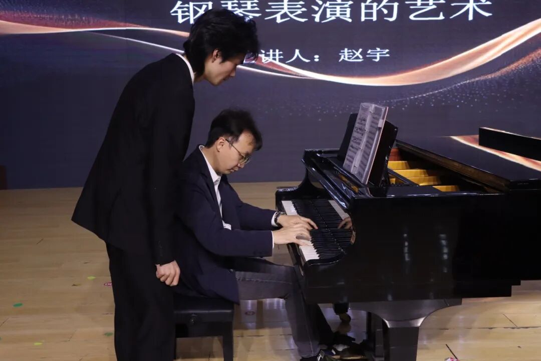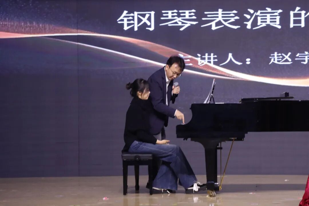 在赵宇教授的钢琴讲座中,三位员工先后登台演奏。第一位员工演绎歌剧改编作品《弄臣》,赵宇教授随即进行指导,深入剖析了作品中戏剧张力的音乐化呈现,并示范如何通过音色对比增强叙事表现力。随后,第二位员工演奏中国作品《山丹丹花开红艳艳》,赵教授着重指导民族和声的色彩运用与地方风格的准确把握,强调在保持原作韵味的基础上进行艺术升华。最后,面对第三位员工带来的高难度技巧作品《钟》,赵教授从触键技巧到声部层次进行逐一解析,亲自示范如何在快速乐段中保持音乐的清晰与美感。整场讲座以"演奏-指导-提升"的互动模式展开,赵宇教授通过精准专业的现场指导,将理论阐释融入每个作品的艺术处理中,使在场师生对钢琴表演的艺术本质有了更深刻的理解。