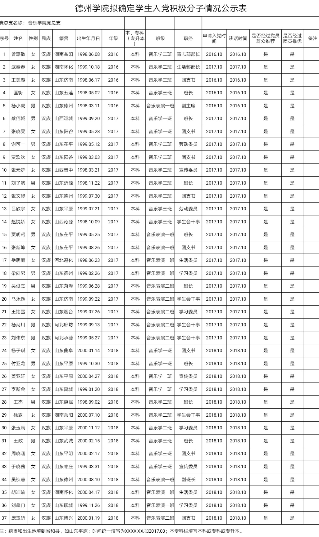 经党组织培养考察,通过党员、群众无记名投票推荐和团员推优,支委会讨论研究,拟确定魏丽、曾惠敏等38人为入党积极分子。为增强工作的透明度,接受党内外群众的监督,确保党员后备队伍的质量,根据上级文件精神和《中共太阳成集团tyc234cc委员会发展党员工作实施细则》的要求,现将拟确定入党积极分子的基本情况公示如下(详见附表):