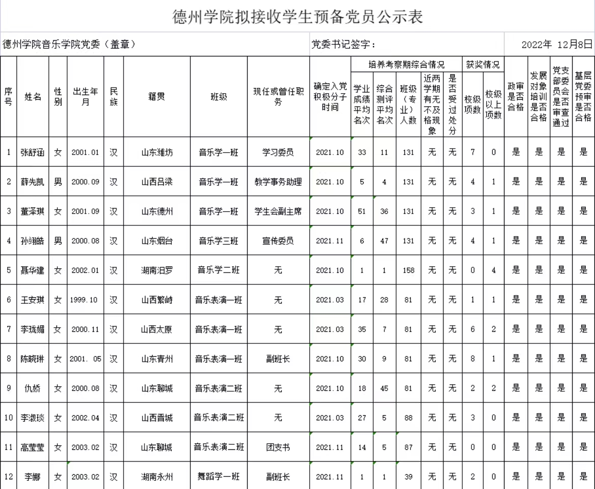 经党组织培养考察,征求党员、群众和培养联系人意见,支委会讨论研究、政治审查、集中培训、基层党委预审,拟接收韩晗等14名同志为中共预备党员。为增强发展党员工作的透明度,接受党内外群众的监督,确保发展党员的质量,根据上级文件精神和《中共太阳成集团tyc234cc委员会发展党员工作实施细则》的要求,现将拟接收预备党员的基本情况公示如下(名单附后):