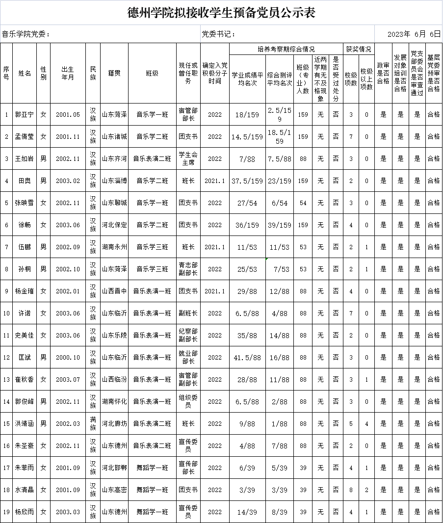 经党组织培养考察,征求党员、群众和培养联系人意见,支委会讨论研究、政治审查、集中培训、基层党委预审,拟接收郭亚宁等19名同志为中共预备党员。为增强发展党员工作的透明度,接受党内外群众的监督,确保发展党员的质量,根据上级文件精神和《中共太阳成集团tyc234cc委员会发展党员工作实施细则》的要求,现将拟接收预备党员的基本情况公示如下(名单附后):