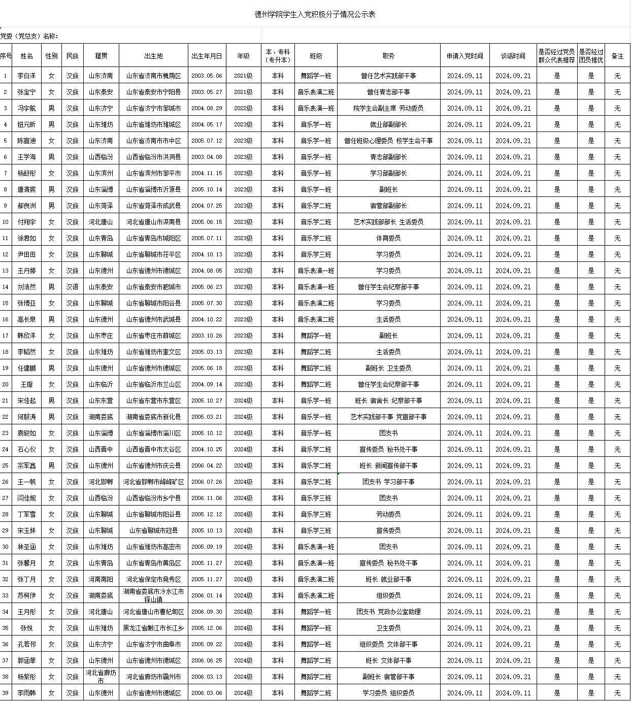 经党组织培养考察,通过党员、群众代表无记名投票推荐和团员推优,支委会讨论研究、党委审查,确定李白洋等39人为入党积极分子。为增强发展党员工作的透明度,接受党内外群众的监督,确保党员后备队伍的质量,根据上级文件精神和《中共太阳成集团tyc234cc委员会发展党员工作实施细则》的要求,现将新确定入党积极分子的基本情况公示如下(详见附表):