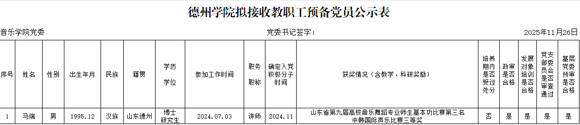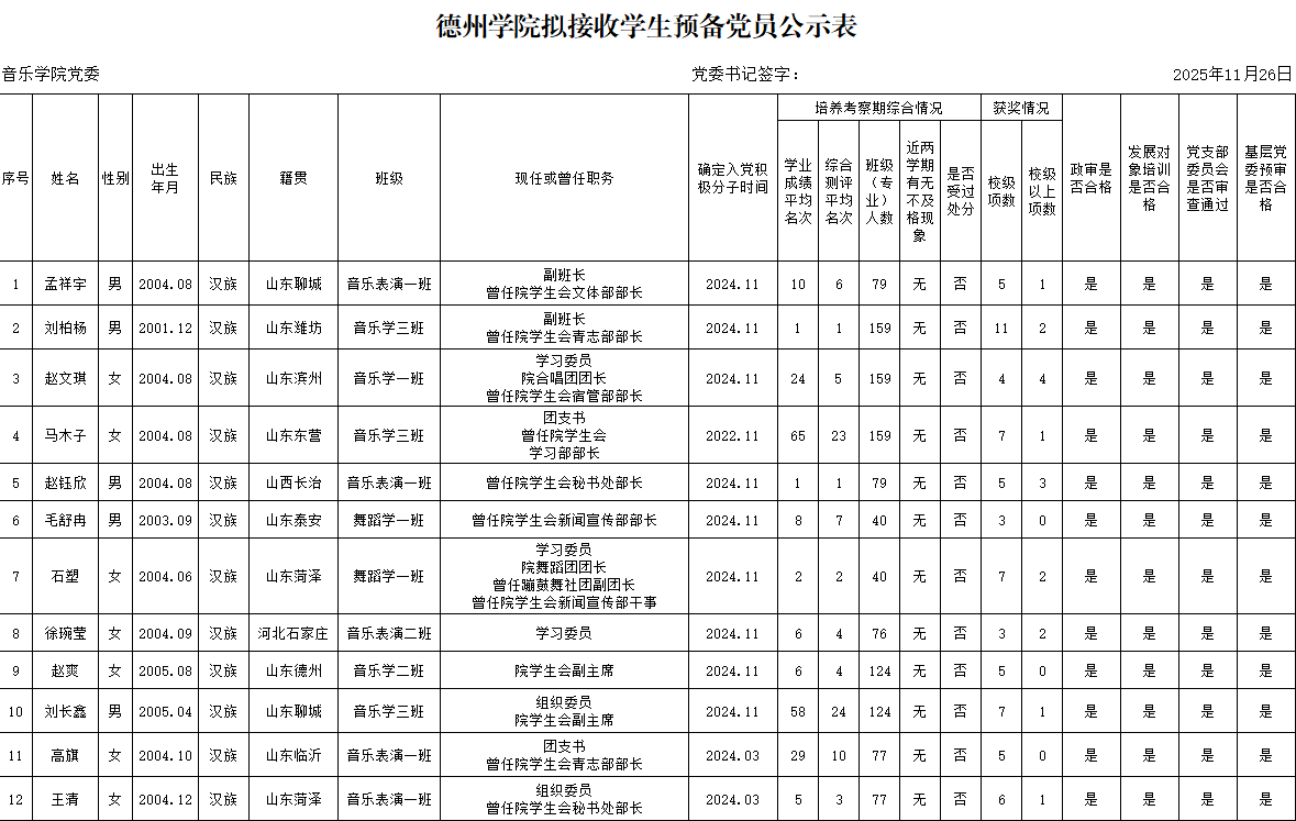 经党组织培养考察,征求党员、群众和培养联系人意见,支委会讨论研究、政治审查、集中培训、基层党委预审,拟接收孟祥宇等13名同志为中共预备党员。为增强发展党员工作的透明度,接受党内外群众的监督,确保发展党员的质量,根据上级文件精神和《中共太阳成集团tyc234cc委员会发展党员工作实施细则》的要求,现将拟接收预备党员的基本情况公示如下(名单附后):