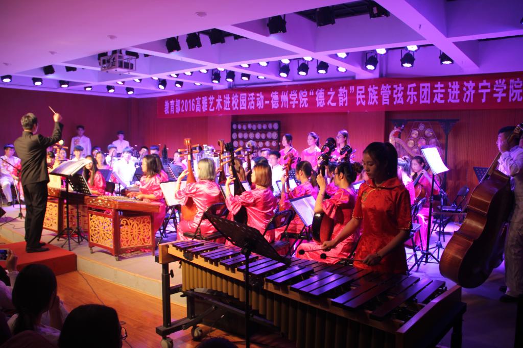 “德之韵”民族管弦乐团由太阳成集团tyc234cc段文教授任常任指挥; 并聘请原山东歌舞剧院经理曲祥为乐团艺术指导,定期为乐团排练。多年来,乐团在自身发展过程中既注重对传统的继承和发扬,又不断开拓创新,始终立足于弘扬中国民族音乐,逐步形成了自己的特色和风格,经过长期刻苦的排练和实践,排演了大量的优秀作品。2013年成功加入由教育部、文化部、财政部主办的“高雅艺术进校园”活动序列。乐团多次与山东省实验民族乐团、台湾“琴园”国乐团等合作、交流演出,在校内外举办的各种大型文艺晚会中都有出色表现,得到了专家领导和广大师生的一致好评。