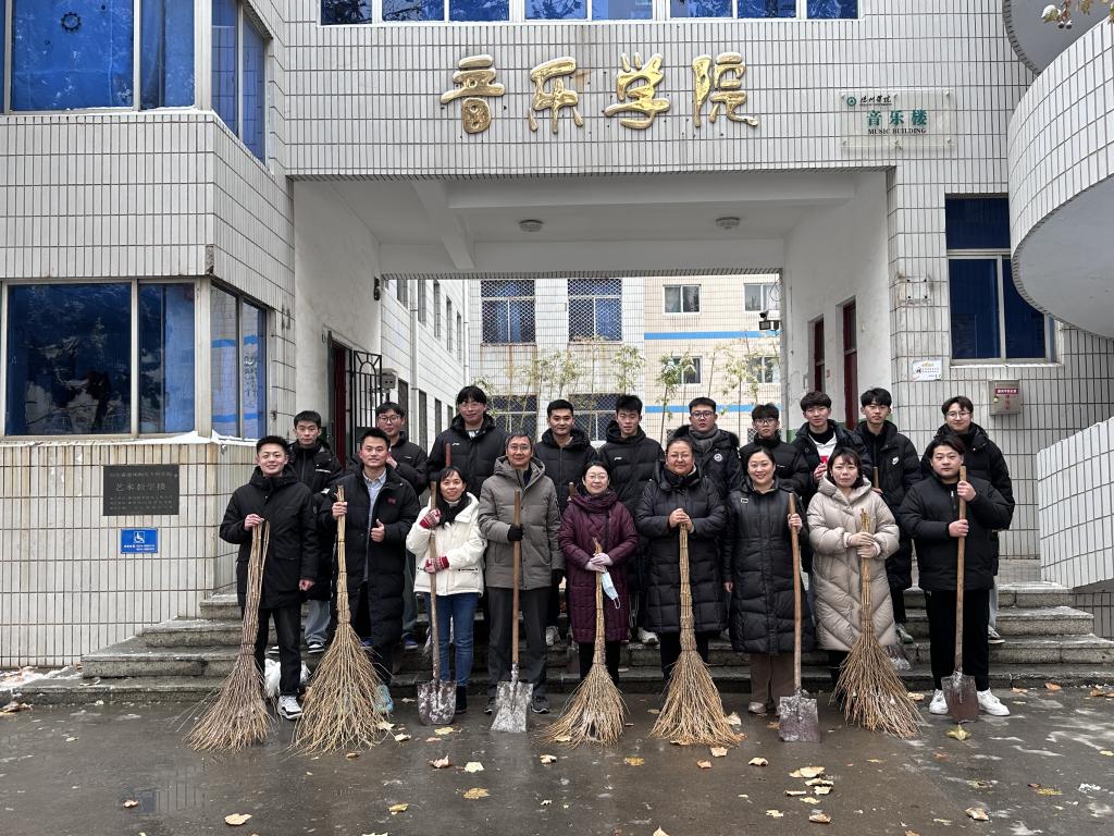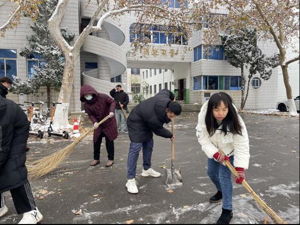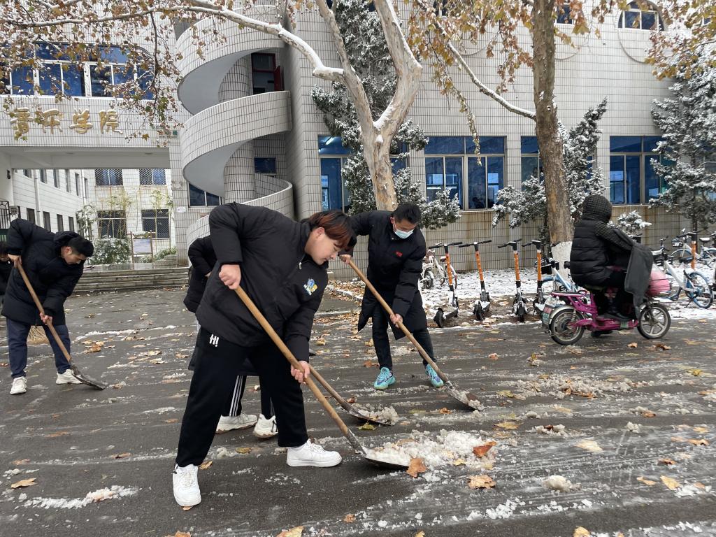 大雪过后,校园银装素裹,美丽的雪景装点了校园,也给校园安全带来了许多隐患。为确保师生出行安全,消除降雪带来的安全隐患,12月11日,公司开展“情暖冬日 扫雪助行”志愿服务活动,党委负责人王桂英、行政负责人段文、党委副书记米彦、教师代表、辅导员老师和员工志愿者共计二十余人参加此次活动。