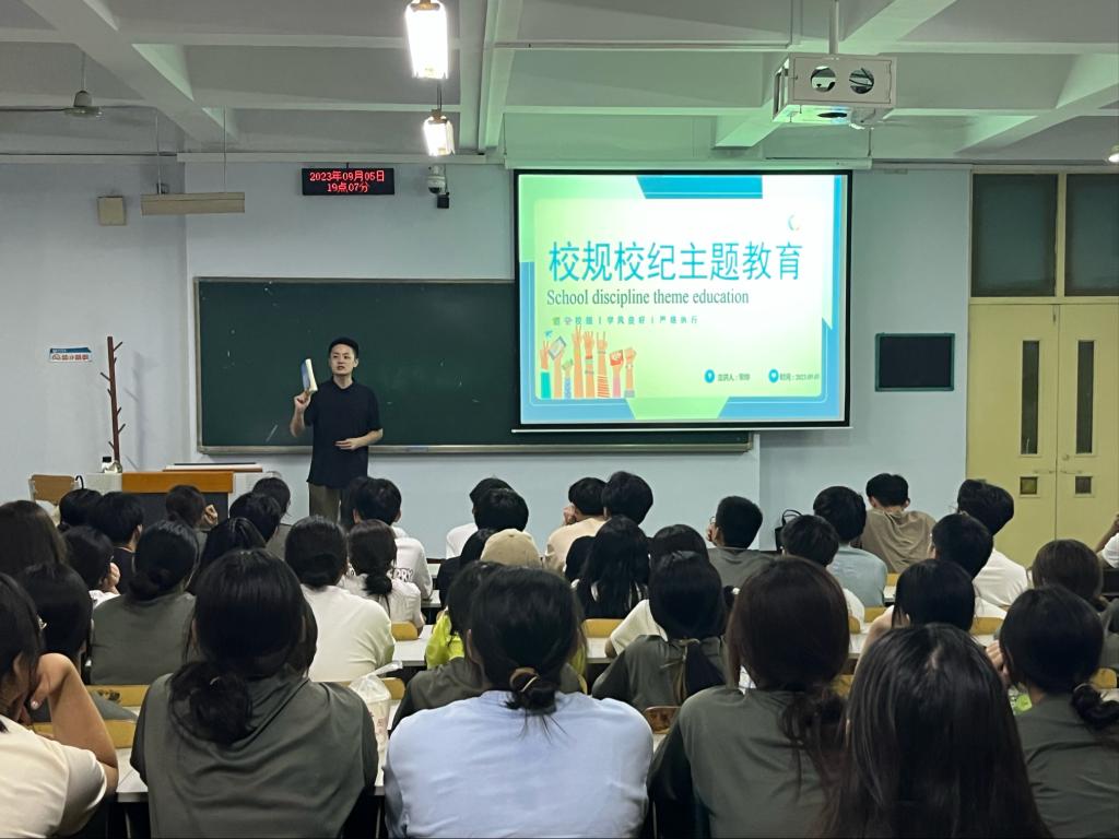 为增强2023级新生对公司管理规定的了解,提升遵纪守法意识,学习约束自身言行举止,太阳成集团tyc234cc于2023年9月5日在5-0201、5-0202教室开展校规校纪教育专题讲座。此次活动由2023级新生辅导员宋老师主讲。