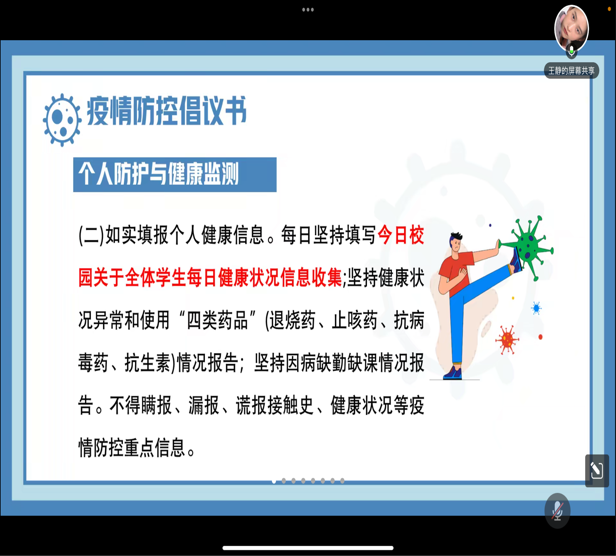 会议开始,主持人首先介绍了当前疫情形势,近期少数地区疫情有所反弹,虽然校内相对安全,但在校同学不能抱有侥幸心理,要做好个人防护,出门戴口罩、吃饭勤洗手、宿舍勤通风。然后从疫情防控角度介绍了每日健康打卡的必要性,利用健康打卡采集数据有利于第一时间掌握全体员工的实时动态,以便于相关部门和机构更好、更快、更科学的研判,制定出相应的防控政策。