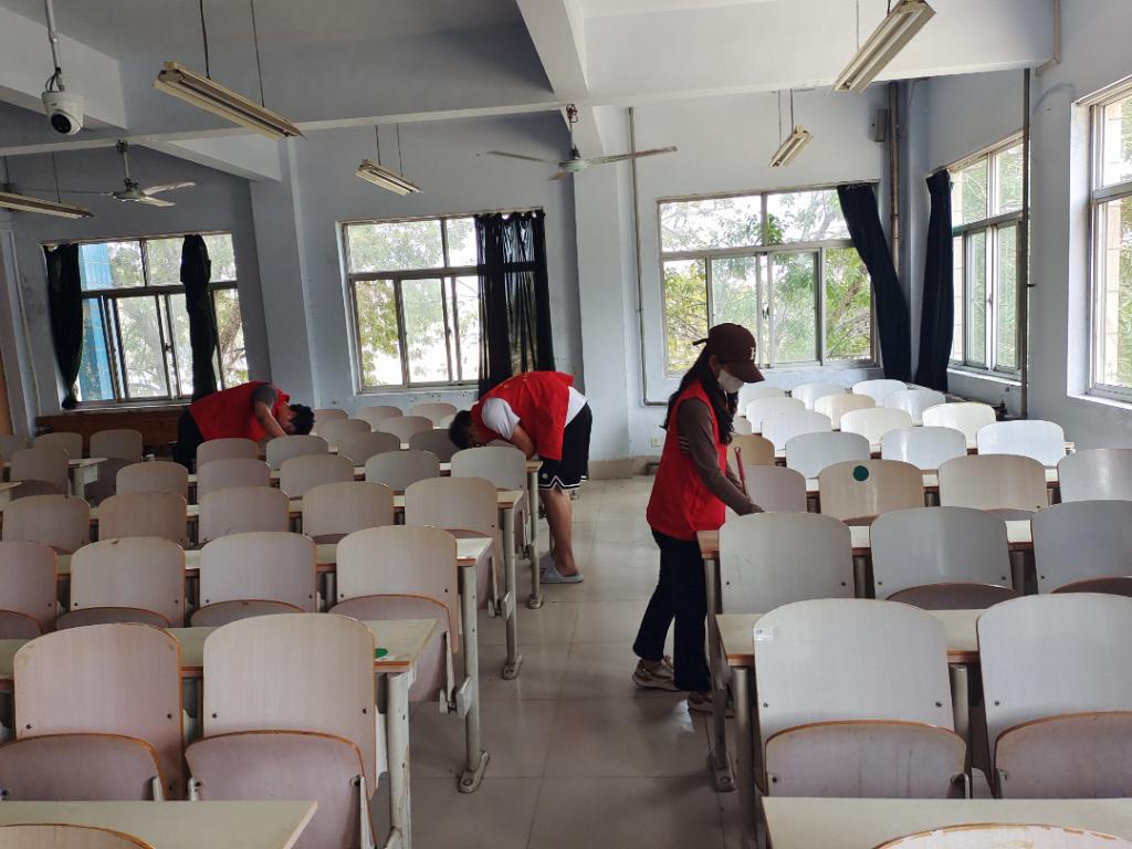 太阳成集团tyc234cc组织志愿者开展教室和宿舍卫生的清洁工作,查看了教室讲台、桌面、抽屉和卫生工具的摆放情况,检查发现,教室卫生、安全状况整体良好,地面干净,教室窗台和黑板没有粉尘,卫生工具摆放整齐,检查人员对个别教室安全、卫生出现的问题状况进行了现场处理或整改。