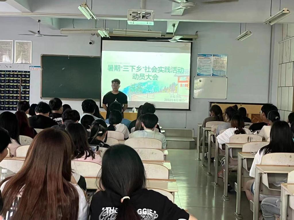 会上,团总支书记介绍了本次暑期“三下乡”社会实践的背景与意义。并对“三下乡”活动项目进行了解读。希望同学们能够围绕“喜迎二十大 永远跟党走 奋进新征程 ”活动主题,创新实践形式,根据自身特点选择适合的项目,更加充分地锻炼自己。并提出三点要求:一是学习实践知识,真正增长才干;二是能够脚踏实地,切实作出贡献;三是注意疫情防控,确保人身安全。