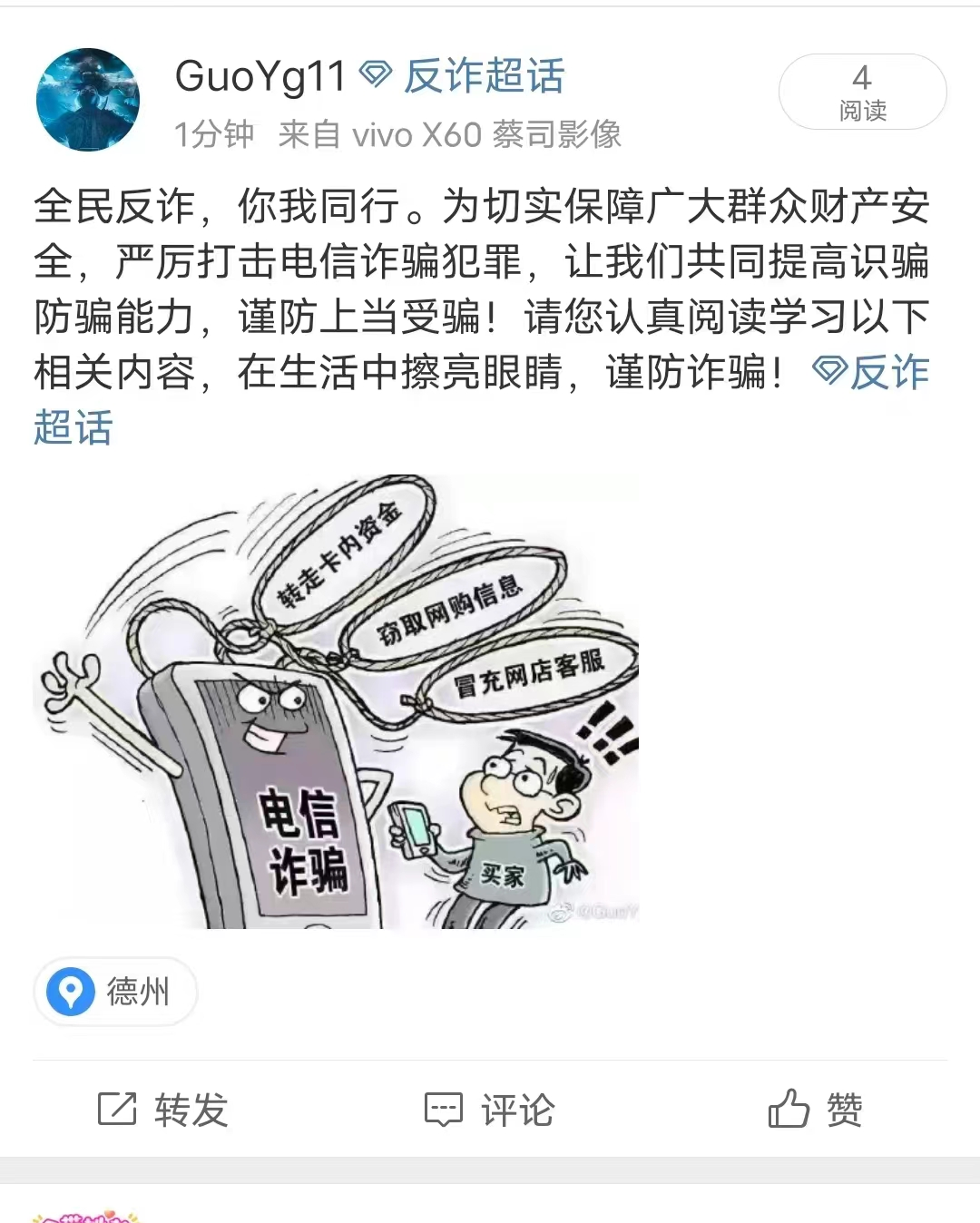 活动期间,公司按照“打击治理电信网络诈骗犯罪集中宣传月”的活动要求,采取线上线下相结合的方式,积极开展防范电信网络诈骗宣传活动。此次活动,开展了防诈骗主题讲座、宣传国家反诈app、签署防诈骗倡议书等多种形式。充分利用微博、抖音等网络媒体,发布识骗要点及防范提醒,极大的发挥了互联网新媒体覆盖广的优势,增强了员工的防范意识。