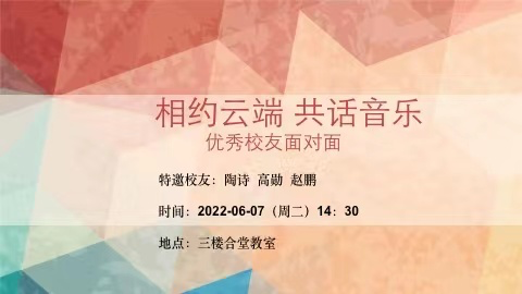 2022年6月7日,公司举办“相约云端 共话音乐”——优秀员工面对面活动,陶诗、高勋、赵鹏三位优秀员工通过腾讯会议在线上与在校生深入交流,音乐表演系主任梁娜主持了此次活动。