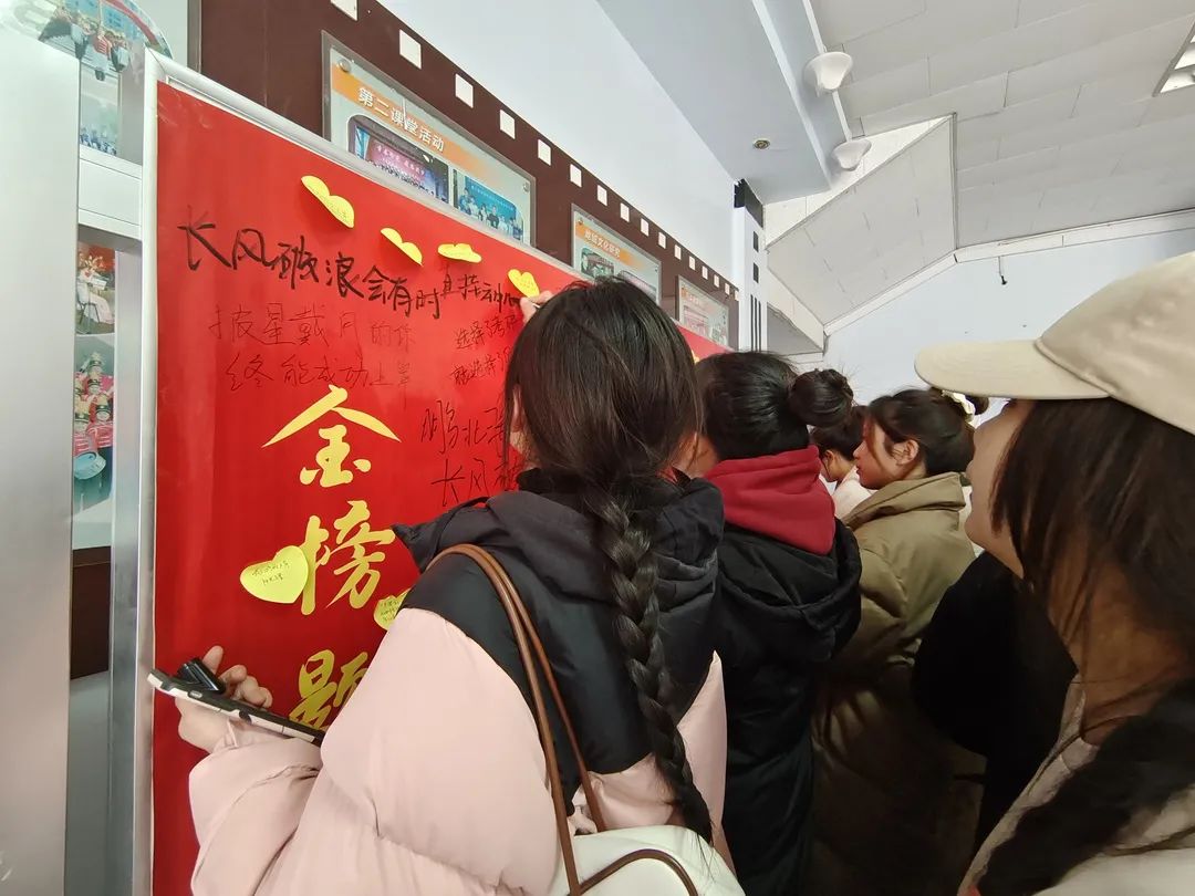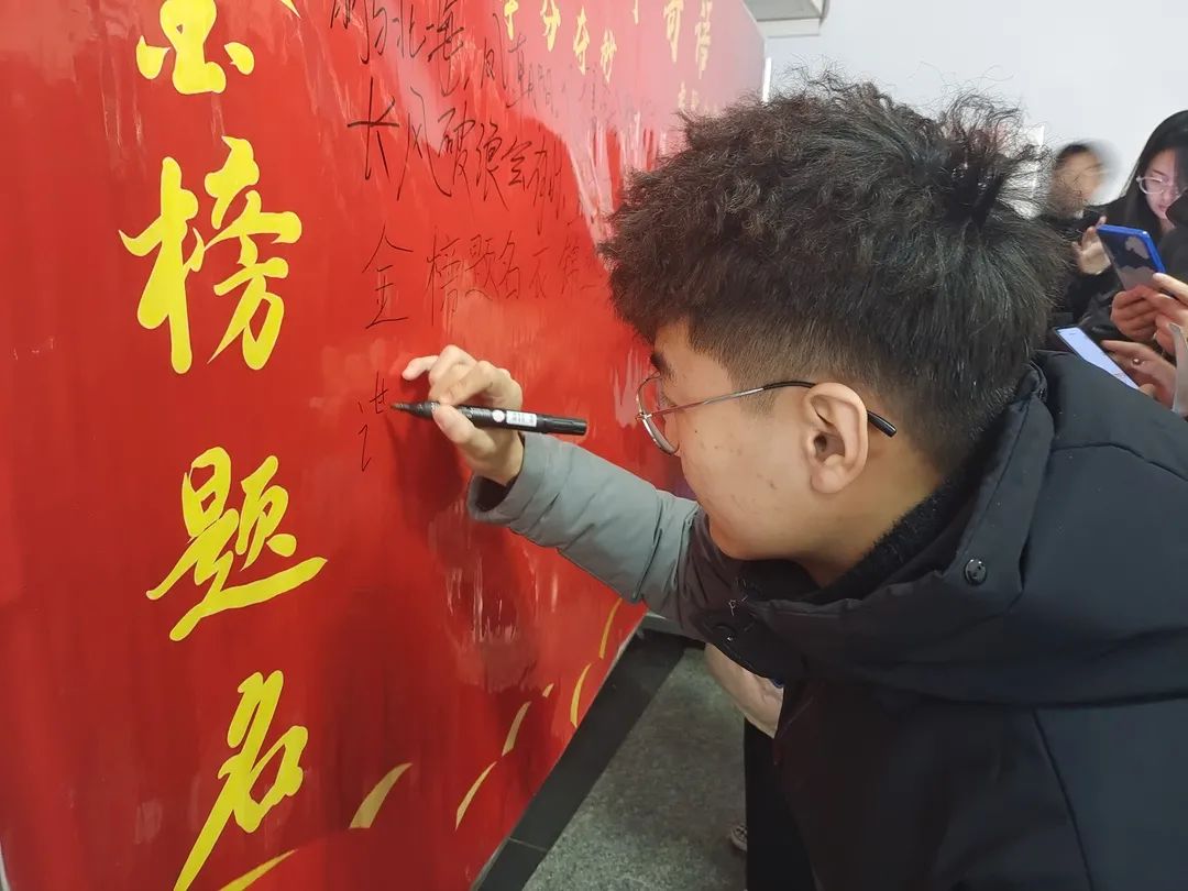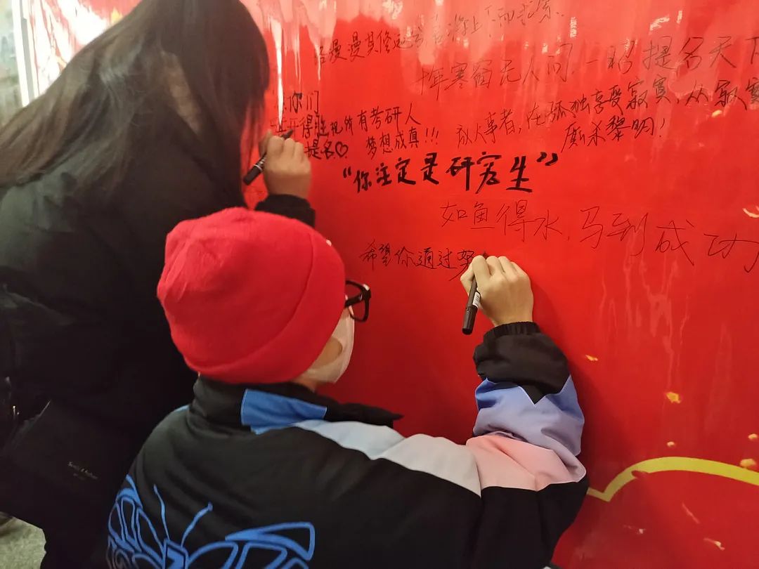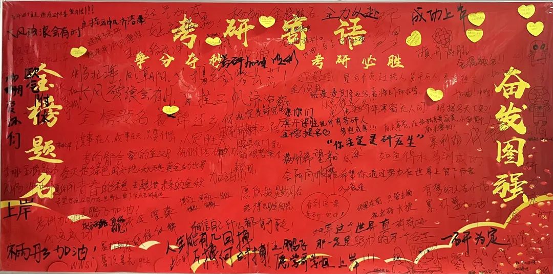 太阳成集团tyc234cc的同学们积极响应号召,在留言板上留下属于自己的勉励话语。言语不多,但却饱含了同学们对学长学姐最真挚的祝福,虽未曾谋面,但已然相识。考研助力板上的留言越来越多,像是星星之火,像是璀璨明星,共同点亮考研人前进的道路。