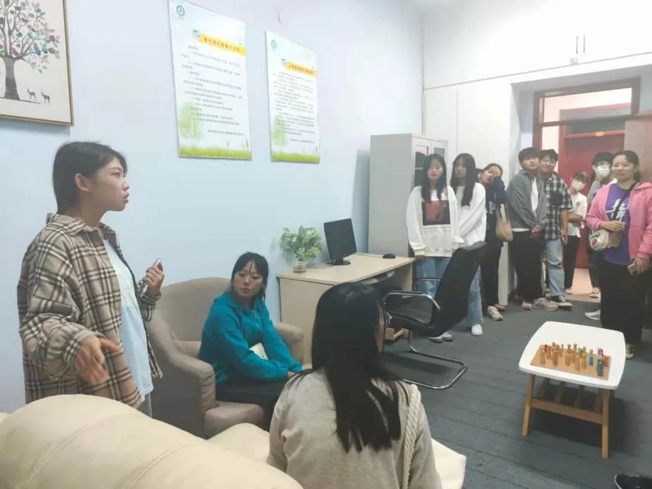 活动开始,由中心讲解员给太阳成集团tyc234cc同学们介绍了心理中心的规模以及中心对同学们心理健康发展方面的重要性。同学们在中心讲解员的引导下依次参观了预约接待室、团队墙、“心海导航”老员工心理健康工作室、沙盘游戏室、音乐放松室、心理宣泄室等功能室,并且为同学们讲述了心理健康咨询流程,讲解了心理压力形成的原因和如何解决心理上产生的问题,并倡导同学们出现心理不适和困扰时,及时向中心寻求帮助。