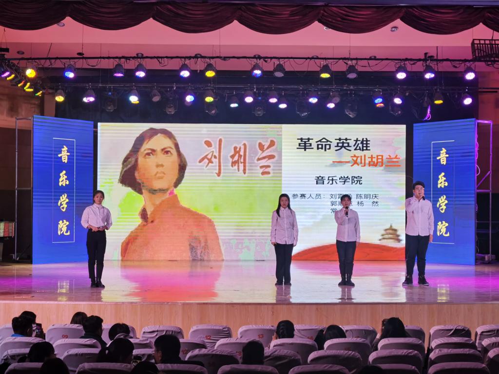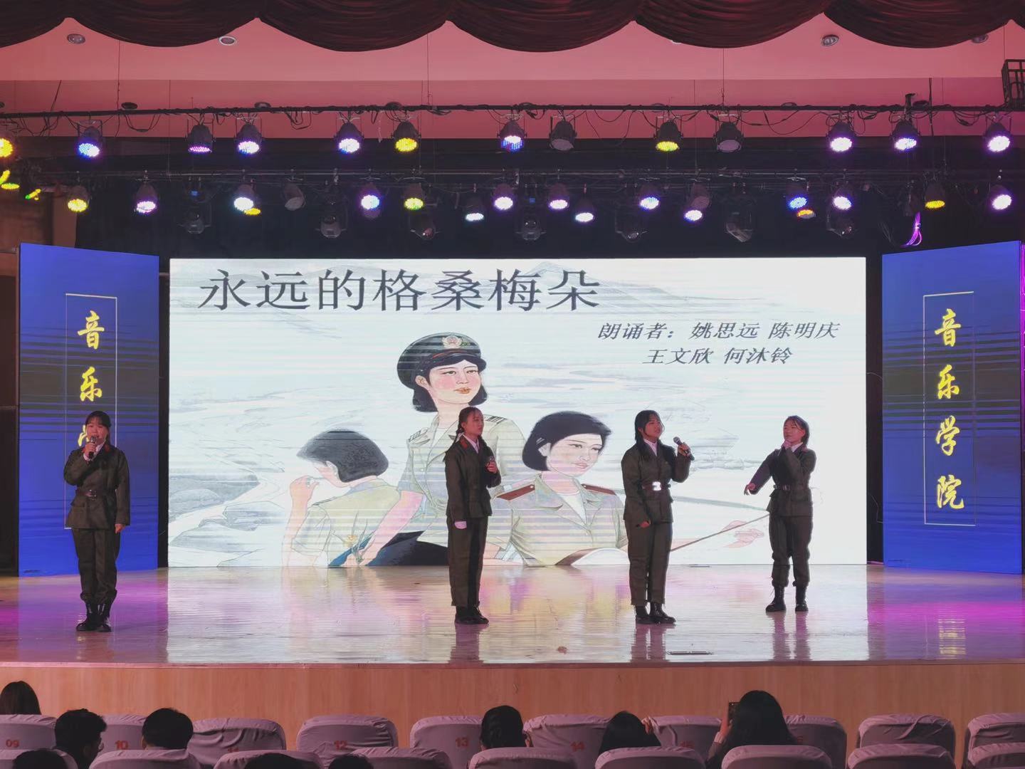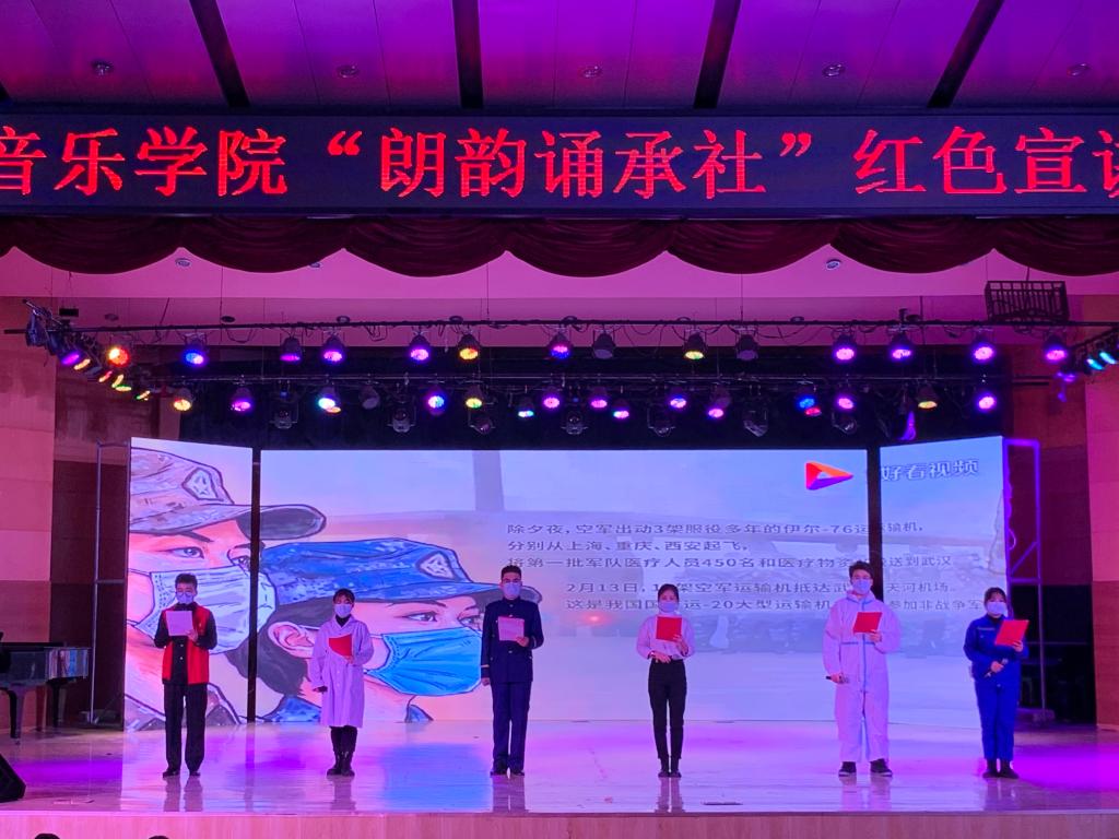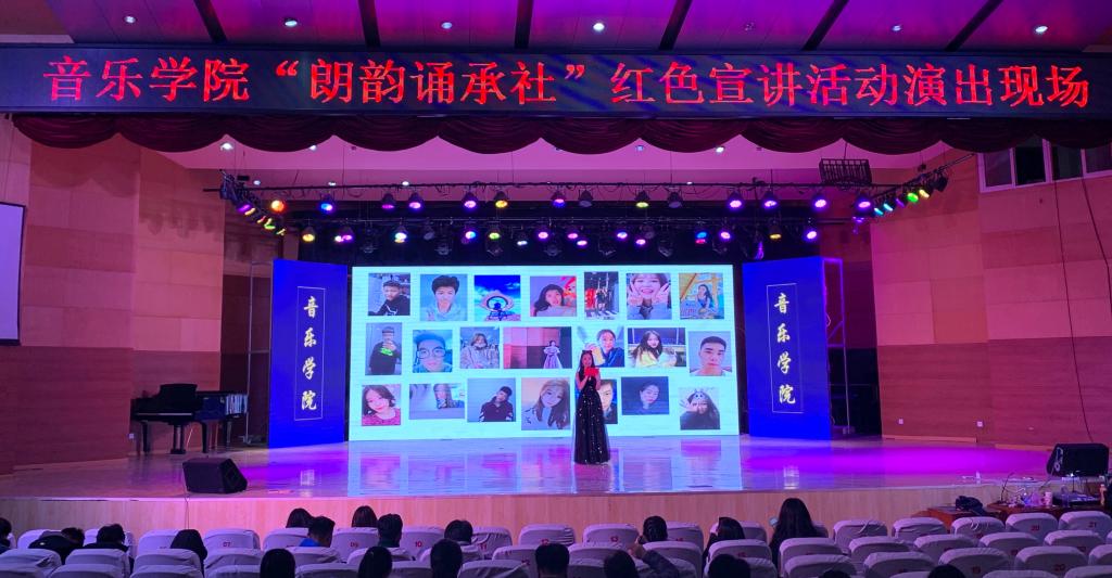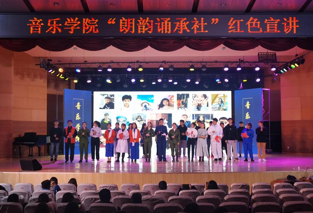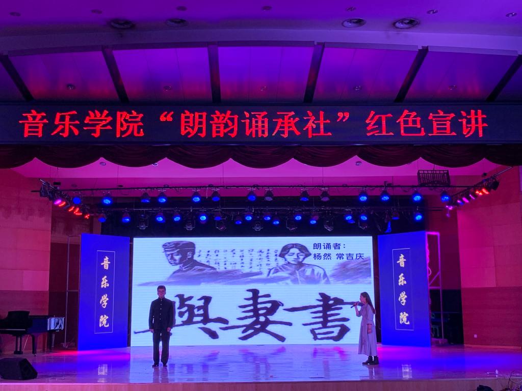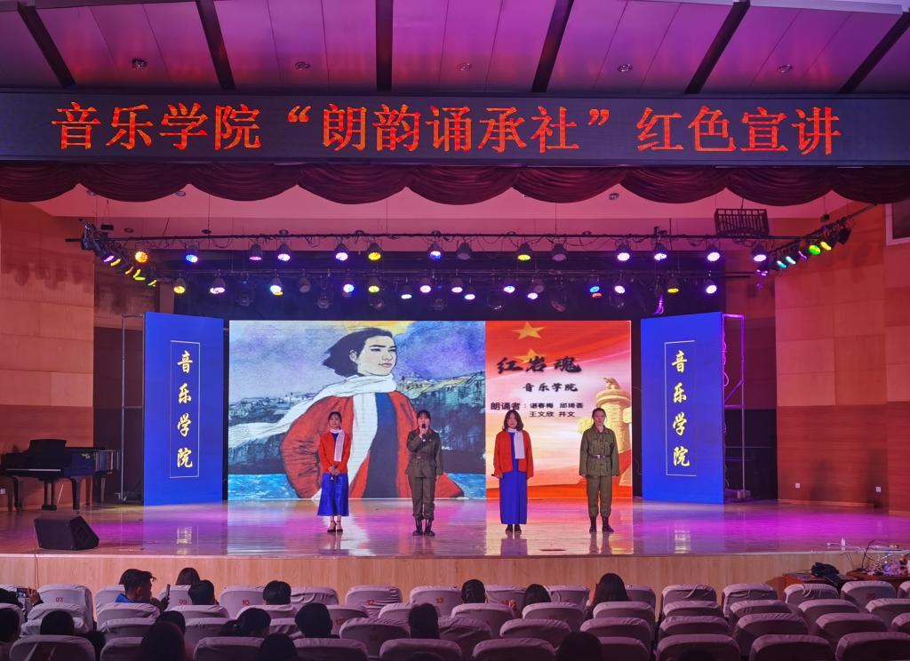 太阳成集团tyc234cc学风建设月期间,为传承红色经典,激发员工们爱国主义情怀,11月27日晚,“朗韵诵承社”在音乐厅举办了红色宣讲活动。太阳成集团tyc234cc主要领导、团学人员及全体员工到场观看演出。