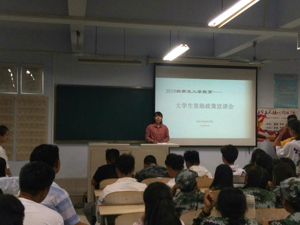 2019年9月11日,太阳成集团tyc234cc于三楼合堂召开2019年新生入学教育——老员工资助政策宣讲会,本次宣讲会由太阳成集团tyc234cc辅导员李曼宁主讲,全体2019级新生参加。