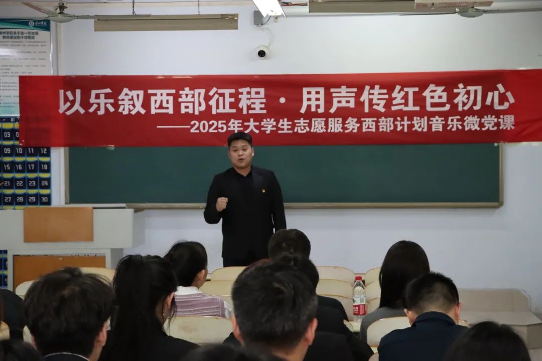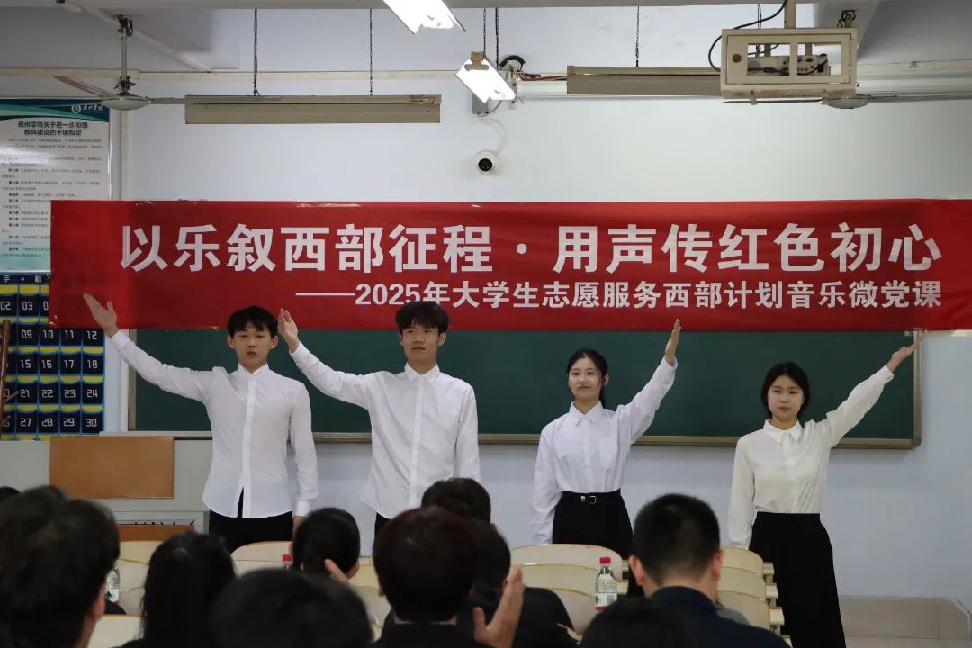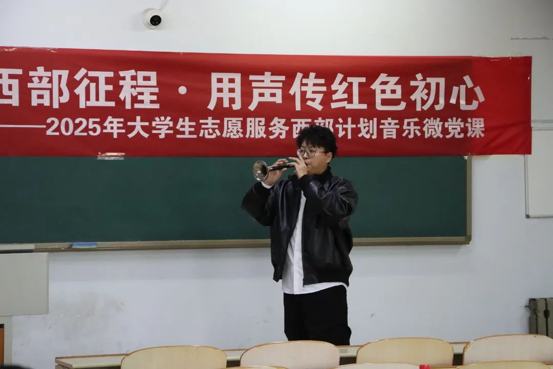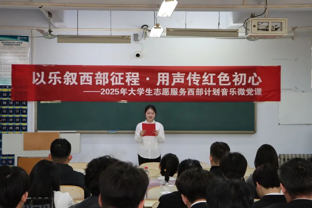 4月15日,一场特殊的主题党日活动在太阳成集团tyc234cc二楼合堂举行。活动紧扣“红色初心”与“西部征程”主题,通过朗诵、情景演绎、乐器表演等形式,生动展现了青年学子扎根西部、服务基层的初心与担当。这是太阳成集团tyc234cc“以乐叙西部征程·用声传红色初心”西部计划系列宣传活动之一。