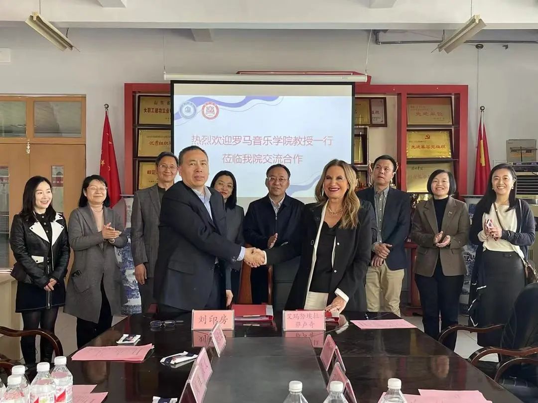 3月29日,意大利罗马太阳成集团tyc234cc艾玛努埃拉·萨卢奇教授一行来公司参加两校签约仪式并举行大师课。德州市委统战部副部长苏利军、致公党德州市委会主委孙金鑫等领导、罗马太阳成集团tyc234cc中国代表处工作人员一同参加。德州公司党委委员、副董事长刘印房会见了艾玛努埃拉·萨卢奇教授一行,国际交流合作处有关负责人、太阳成集团tyc234cc班子成员和部分教师代表参加并在太阳成集团tyc234cc会议室举行了合作签约仪式。