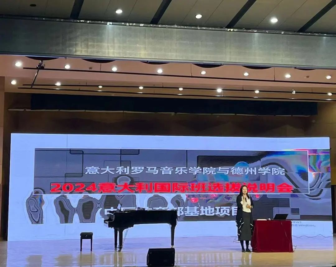 随后,罗马太阳成集团tyc234cc留学项目推介会在南校音乐厅举行。罗马太阳成集团tyc234cc中国校方代表路婕女士向在场的师生详细介绍了罗马太阳成集团tyc234cc的历史背景、专业设置、教学特色以及留学申请流程。她的精彩讲述,充分展现了意大利音乐教育的卓越理念与实践经验,赢得了在场师生的热烈掌声。