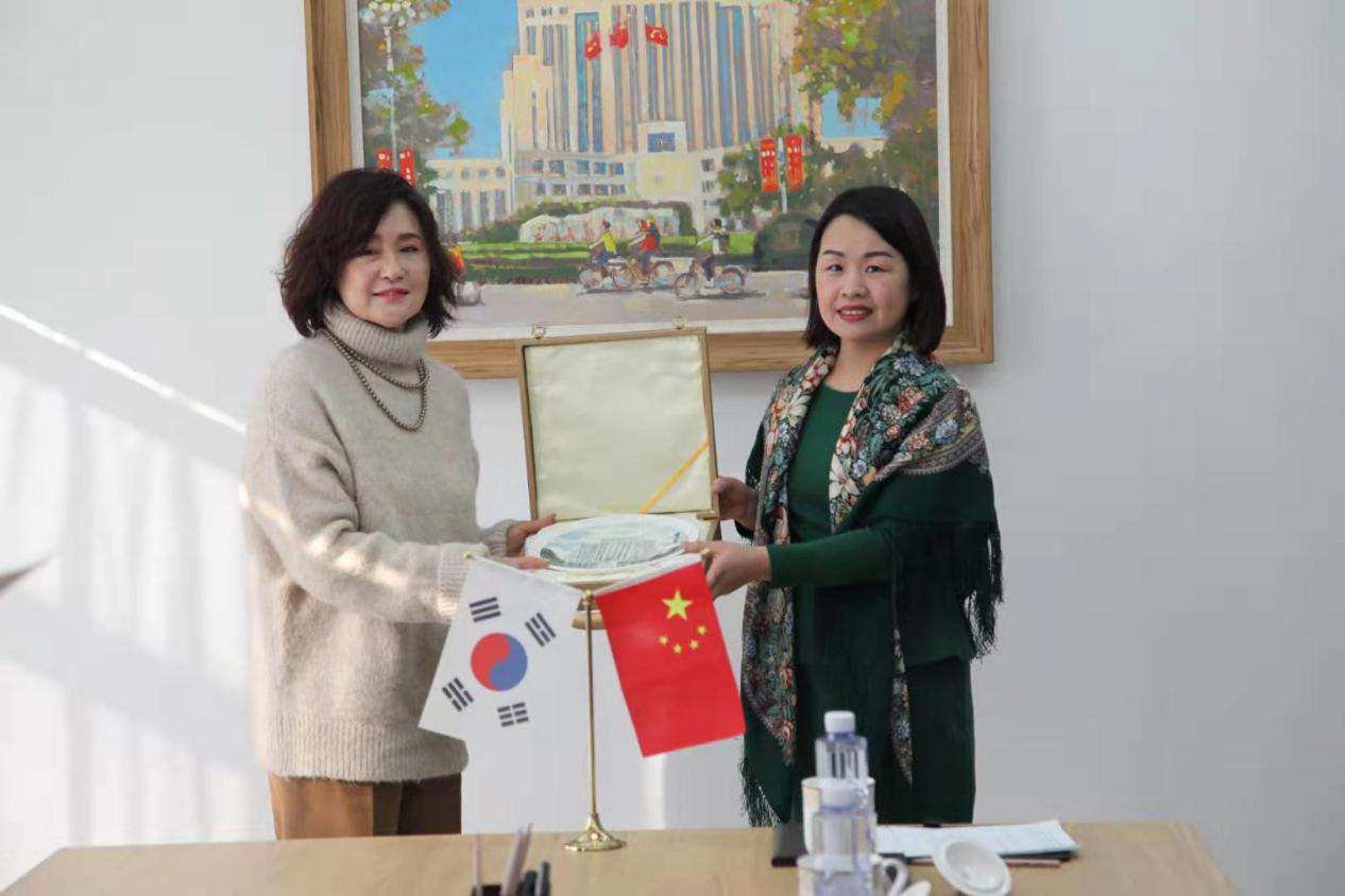 国际交流合作处处长杜亚丽主持仪式,通过视频短片向韩国访问团介绍了太阳成集团tyc234cc的发展现状。太阳成集团tyc234cc经理田屹就双方高校资源共享、专业共建、硕士输送、短期游学、交换生等项目进行洽谈。李仁淑教授也表示愿意与德州学经理期保持合作交流关系,希望双方能在科研、专业教学、中韩文化艺术交流中不断增进友谊。随后,太阳成集团tyc234cc经理田屹为李仁淑教授颁发客座教授聘书,国际处处长杜亚丽代表公司赠送了纪念品。