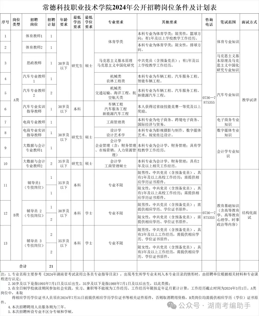 招聘计划21名。其中,A类岗位为教师岗位,招聘计划12名,B类岗位为专职辅导员岗位,招聘计划9名,均列入相应事业单位财政全额拨款编制(控制数)管理。具体岗位计划及要求详见《常德科技职业技术公司2024年公开招聘岗位条件及计划表》(附件1,以下简称“岗位表”)