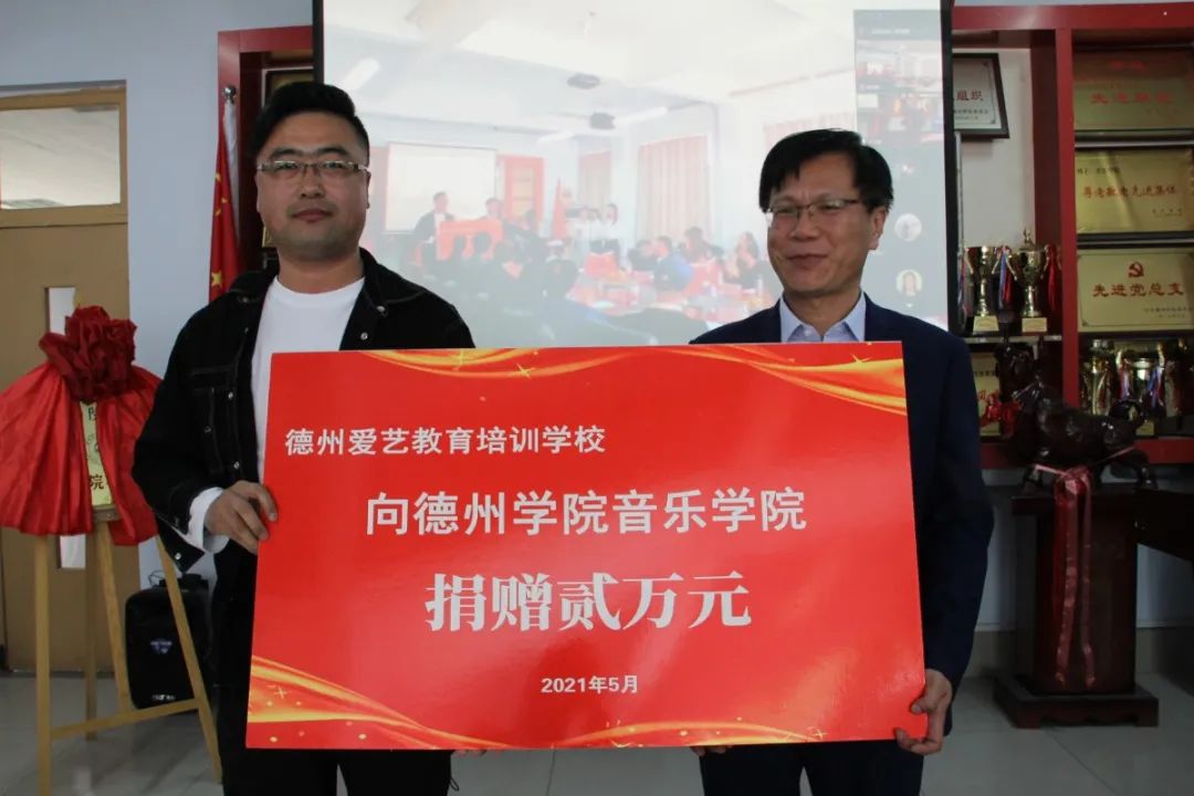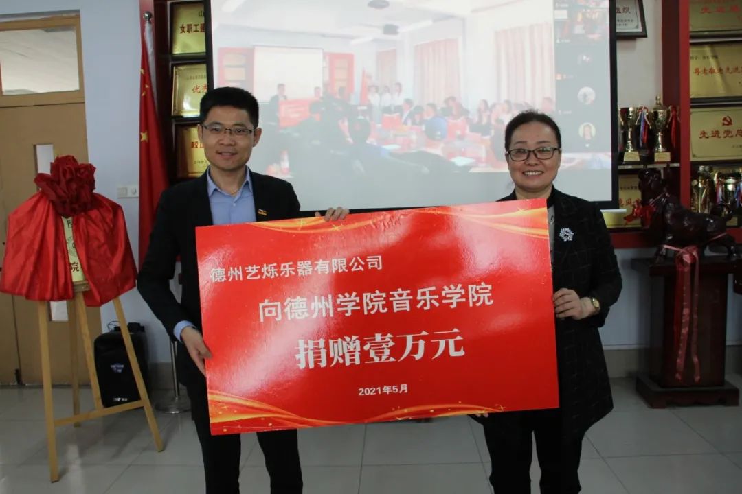 会上还举行了音乐公司员工捐赠仪式。2009届员工孙建与2012届员工司福山上台捐赠,公司党总支书记刘志华与经理田屹代表公司接受捐赠。