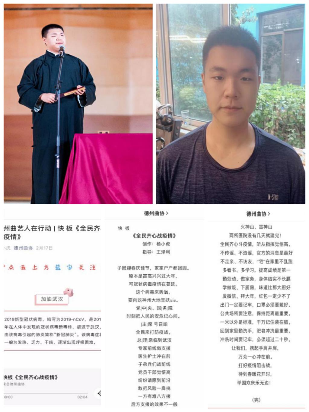 毕业后,他毅然决定参军入伍,用一身专业本领接受军营的历练,实现自己心中积淀已久的梦想。他说自己要:“青春无悔,不负韶华。携笔从戎,御马戍边。”他知道:“强国兴军有我辈,岁月静好保家乡。”在新冠肺炎疫情爆发最严重的时候,他独立创作快板《全民齐心战疫情》,代表德州市曲协在全市范围内发表。是金子总要发光,祝愿他在猎猎军旗下能够继续创造更多的辉煌!