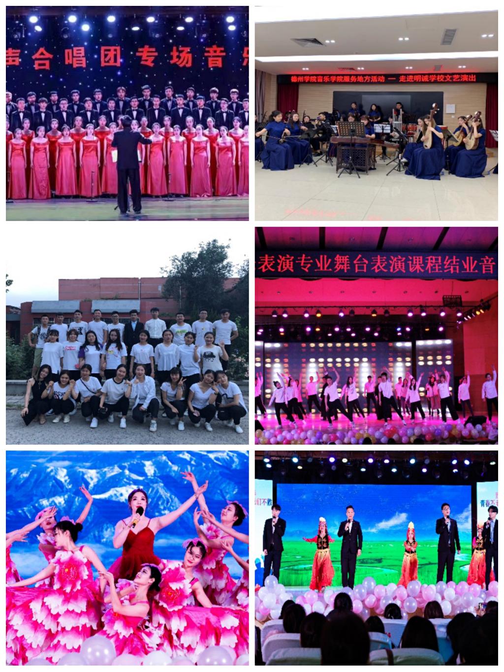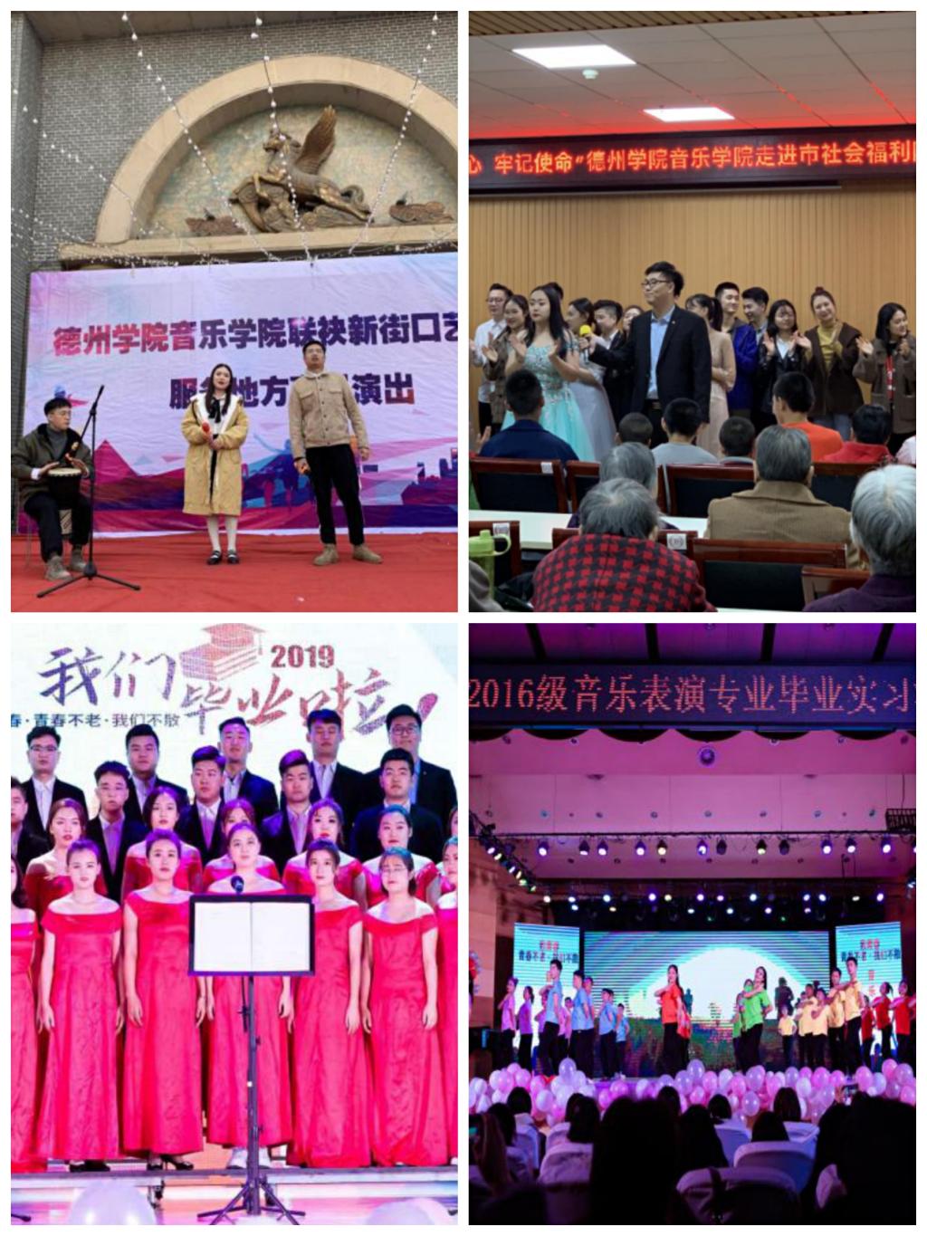 音乐表演专业秉承“实践育人”理念,以培养员工专业综合素质与实践创新能力相结合的实践育人思路,确立了“课堂—舞台—社会”三元结构实践教学体系。员工除在校内进行大量艺术社团排练、专业舞台实践外,还定期走乡村、进社区、入公司,通过舞台表演实践活动观察社会,服务地方文化建设。