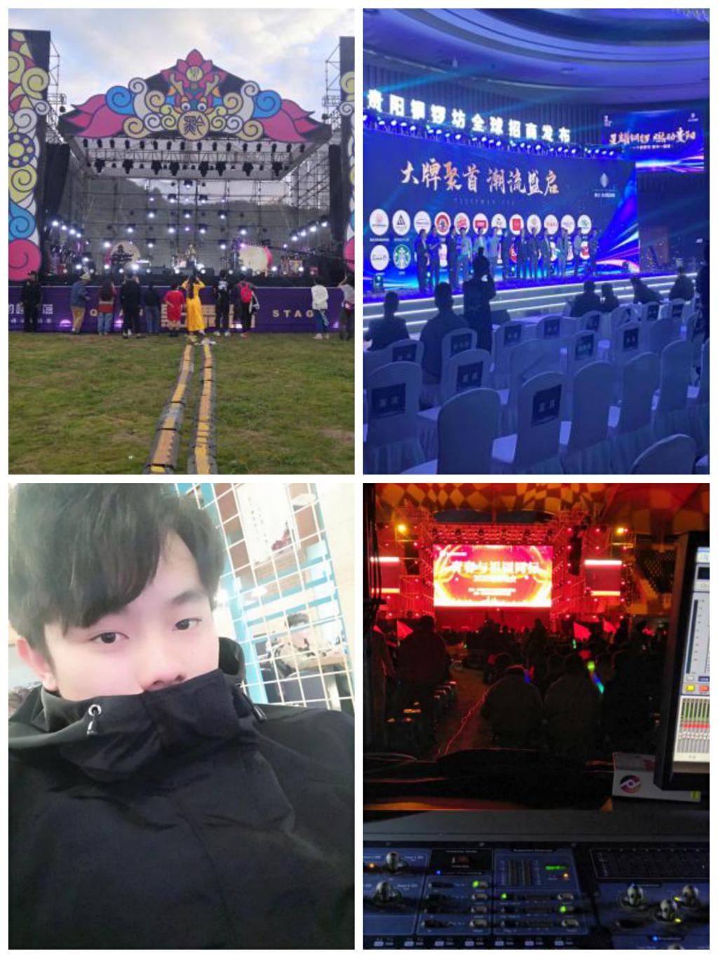 毕业后,他回到家乡贵州,开始人生新的逐梦路程。凭借在大学期间练就的舞台音响调控本领,现就职于贵州纯五度文化传媒有限公司,担任公司大型文艺演出的调音师,参与了多场贵阳市各种大型文艺演出活动。他正在用自己的专业能力和实际行动,为家乡的音乐文化建设做出青春的贡献。
