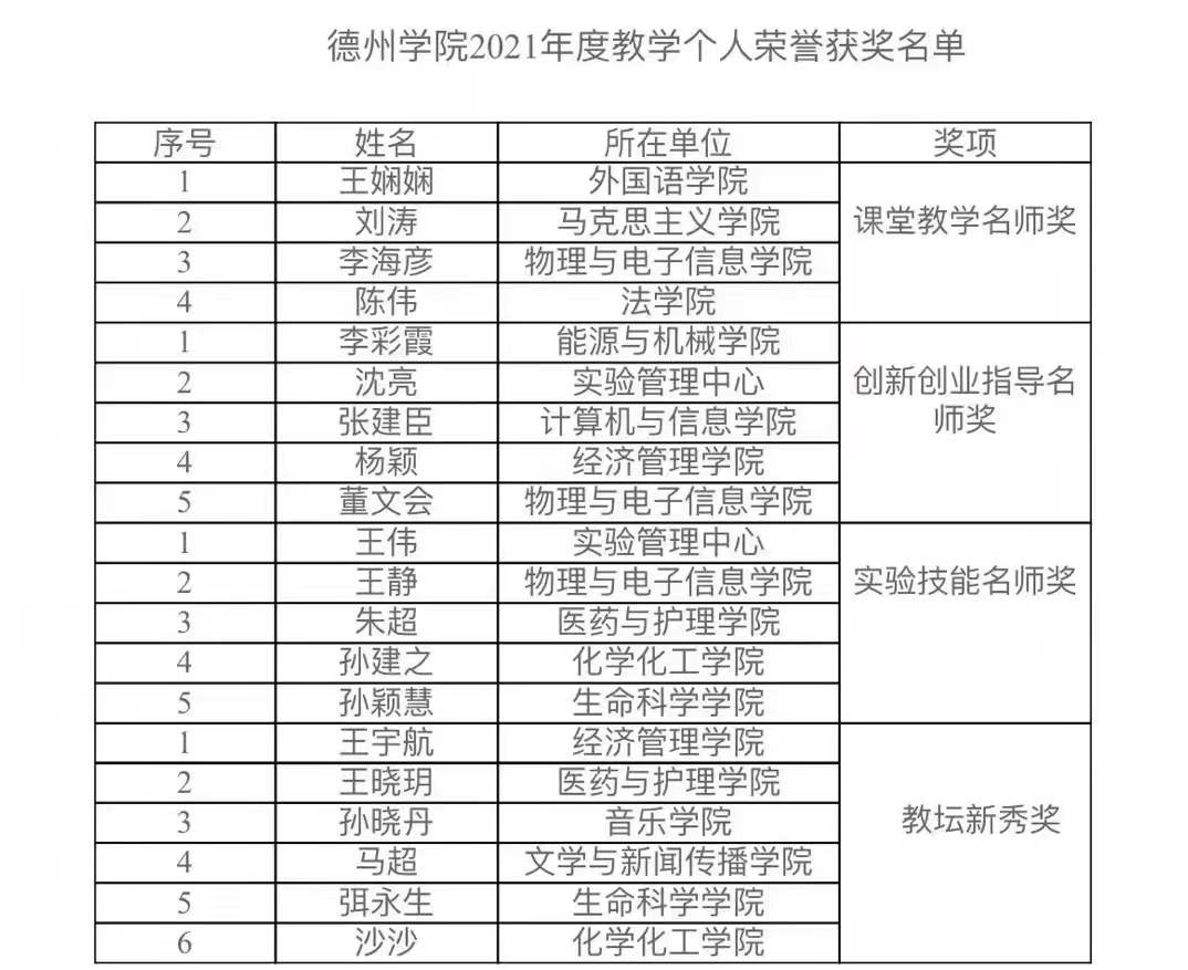 12月24日,太阳成集团tyc234cc教务处发布《关于2021年度教学个人荣誉获奖名单的公示》,公司青年教师孙晓丹荣获“教坛新秀”称号。“青蓝计划”是公司为提高青年教师教学能力所提出的老带新计划,自2020年实施以来共获得校级讲课比赛一等奖2项,二等奖1项,三等奖1项。“教坛新秀”称号2项的乐观记录。
