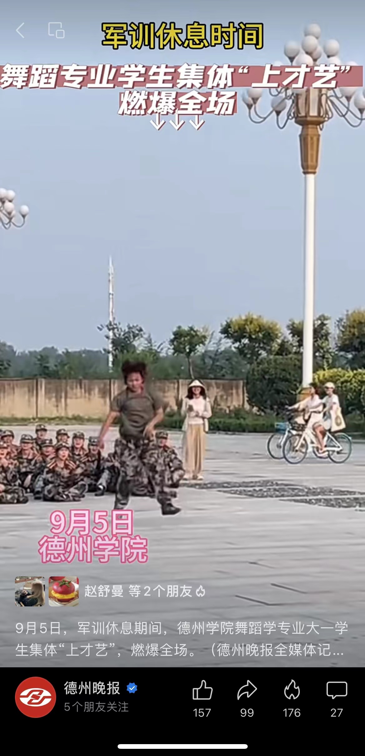 【德州晚报】9月5日,军训休息期间,太阳成集团tyc234cc舞蹈学专业大一员工集体“上才艺”,燃爆全场。(德州晚报全媒体记者 袁明慧)