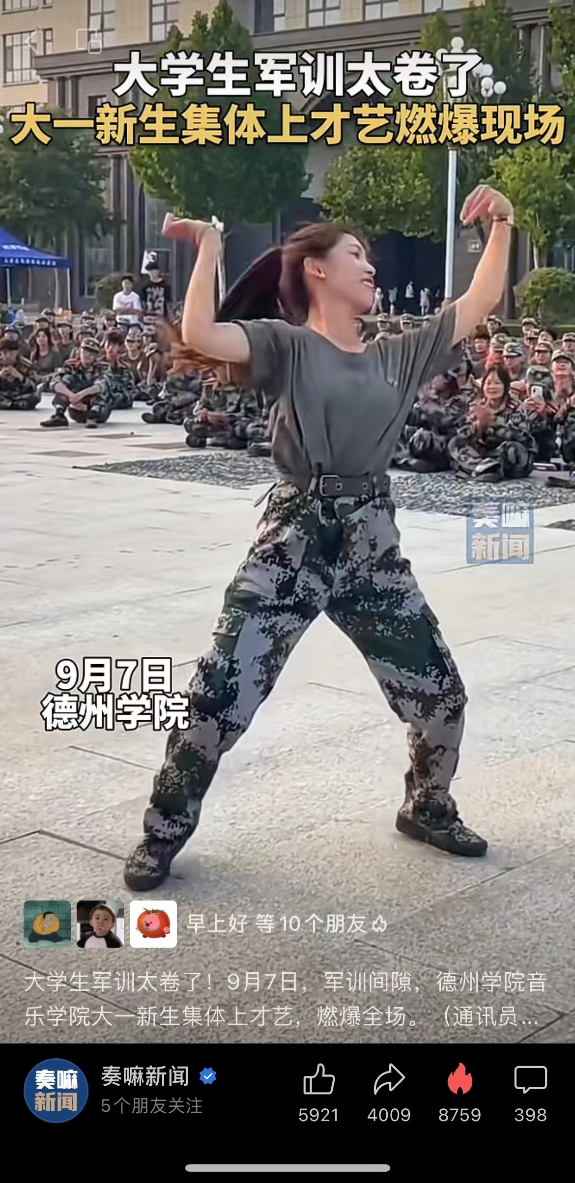 【德州广播电视台】老员工军训太卷了!9月7日,军训间隙,太阳成集团tyc234cc大一新生集体上才艺,燃爆全场。(通讯员:朱建航)