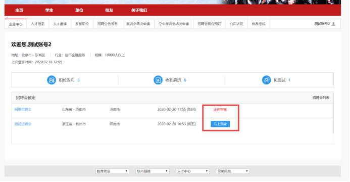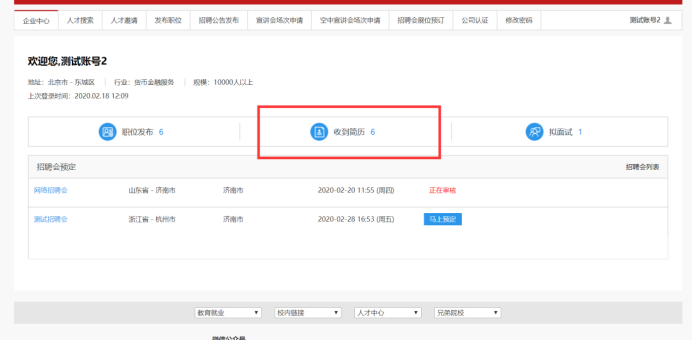 单位报名成功并且公司管理员审核通过之后,单位可以维护网络招聘会简历接收的数据。