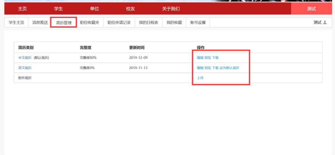 员工登录后,可在线制作简历(中文简历、英文简历),也可以直接上传附件简历。
