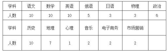 高中语文10人,高中数学10人,高中英语10人,高中物理7人,高中化学7人,高中生物7人,高中政治7人,高中历史7人,高中地理7人,音乐4人,体育4人,美术4人,信息技术2人,心理健康2人,共计88人。