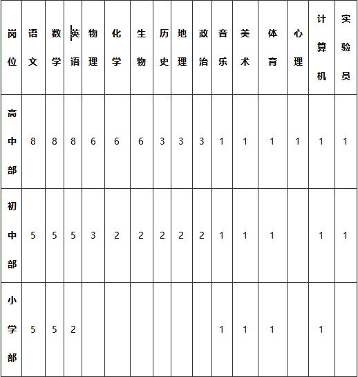 高中部语文、数学、英语、道德与法治、历史、地理、生物、化学、物理、信息技术、美术、音乐、体育、心理教育学科教师。